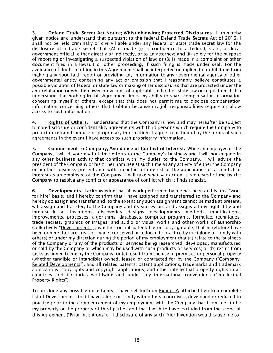 DocuSign Envelope ID: 013699B5-EA8E-4103-95BE-1461AC129709 3. Defend Trade Secret Act Notice; Whistleblowing; Protected Disclosures. I am hereby given notice and understand that pursuant to the federal Defend Trade Secrets Act of 2016, I shall not be held criminally or civilly liable under any federal or state trade secret law for the disclosure of a trade secret that (A) is made (i) in confidence to a federal, state, or local government official, either directly or indirectly, or to an attorney; and (ii) solely for the purpose of reporting or investigating a suspected violation of law; or (B) is made in a complaint or other document filed in a lawsuit or other proceeding, if such filing is made under seal. For the avoidance of doubt, nothing in this Agreement shall be interpreted or applied to prohibit me from making any good faith report or providing any information to any governmental agency or other governmental entity concerning any act or omission that I reasonably believe constitutes a possible violation of federal or state law or making other disclosures that are protected under the anti-retaliation or whistleblower provisions of applicable federal or state law or regulation. I also understand that nothing in this Agreement limits my ability to share compensation information concerning myself or others, except that this does not permit me to disclose compensation information concerning others that I obtain because my job responsibilities require or allow access to such information. 4. Rights of Others. I understand that the Company is now and may hereafter be subject to non-disclosure or confidentiality agreements with third persons which require the Company to protect or refrain from use of proprietary information. I agree to be bound by the terms of such agreements in the event I have access to such proprietary information. 5. Commitment to Company; Avoidance of Conflict of Interest. While an employee of the Company, I will devote my full-time efforts to the Company’s business and I will not engage in any other business activity that conflicts with my duties to the Company. I will advise the president of the Company or his or her nominee at such time as any activity of either the Company or another business presents me with a conflict of interest or the appearance of a conflict of interest as an employee of the Company. I will take whatever action is requested of me by the Company to resolve any conflict or appearance of conflict which it finds to exist. 6. Developments. I acknowledge that all work performed by me has been and is on a “work for hire” basis, and I hereby confirm that I have assigned and transferred to the Company and hereby do assign and transfer and, to the extent any such assignment cannot be made at present, will assign and transfer, to the Company and its successors and assigns all my right, title and interest in all inventions, discoveries, designs, developments, methods, modifications, improvements, processes, algorithms, databases, computer programs, formulae, techniques, trade secrets, graphics or images, and audio or visual works and other works of authorship (collectively “Developments”), whether or not patentable or copyrightable, that heretofore have been or hereafter are created, made, conceived or reduced to practice by me (alone or jointly with others) or under my direction during the period of my employment that (a) relate to the business of the Company or any of the products or services being researched, developed, manufactured or sold by the Company or which may be used with such products or services; or (b) result from tasks assigned to me by the Company; or (c) result from the use of premises or personal property (whether tangible or intangible) owned, leased or contracted for by the Company (“Company- Related Developments”), and all related patents, patent applications, trademarks and trademark applications, copyrights and copyright applications, and other intellectual property rights in all countries and territories worldwide and under any international conventions (“Intellectual Property Rights”). To preclude any possible uncertainty, I have set forth on Exhibit A attached hereto a complete list of Developments that I have, alone or jointly with others, conceived, developed or reduced to practice prior to the commencement of my employment with the Company that I consider to be my property or the property of third parties and that I wish to have excluded from the scope of this Agreement (“Prior Inventions”). If disclosure of any such Prior Invention would cause me to 16