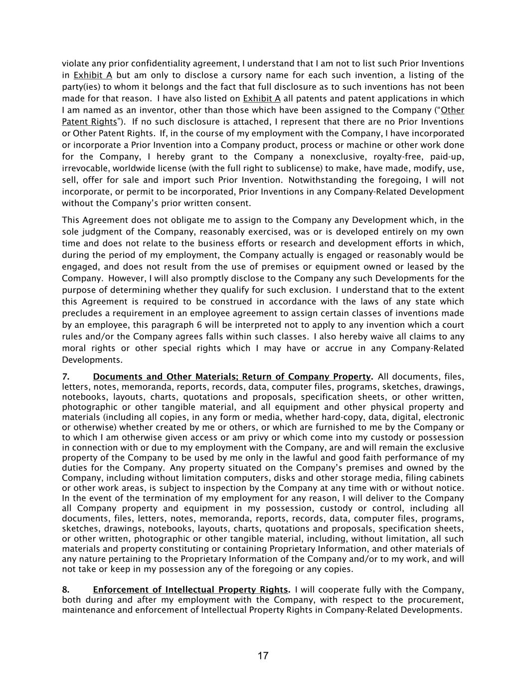 DocuSign Envelope ID: 013699B5-EA8E-4103-95BE-1461AC129709 violate any prior confidentiality agreement, I understand that I am not to list such Prior Inventions in Exhibit A but am only to disclose a cursory name for each such invention, a listing of the party(ies) to whom it belongs and the fact that full disclosure as to such inventions has not been made for that reason. I have also listed on Exhibit A all patents and patent applications in which I am named as an inventor, other than those which have been assigned to the Company (“Other Patent Rights”). If no such disclosure is attached, I represent that there are no Prior Inventions or Other Patent Rights. If, in the course of my employment with the Company, I have incorporated or incorporate a Prior Invention into a Company product, process or machine or other work done for the Company, I hereby grant to the Company a nonexclusive, royalty-free, paid-up, irrevocable, worldwide license (with the full right to sublicense) to make, have made, modify, use, sell, offer for sale and import such Prior Invention. Notwithstanding the foregoing, I will not incorporate, or permit to be incorporated, Prior Inventions in any Company-Related Development without the Company’s prior written consent. This Agreement does not obligate me to assign to the Company any Development which, in the sole judgment of the Company, reasonably exercised, was or is developed entirely on my own time and does not relate to the business efforts or research and development efforts in which, during the period of my employment, the Company actually is engaged or reasonably would be engaged, and does not result from the use of premises or equipment owned or leased by the Company. However, I will also promptly disclose to the Company any such Developments for the purpose of determining whether they qualify for such exclusion. I understand that to the extent this Agreement is required to be construed in accordance with the laws of any state which precludes a requirement in an employee agreement to assign certain classes of inventions made by an employee, this paragraph 6 will be interpreted not to apply to any invention which a court rules and/or the Company agrees falls within such classes. I also hereby waive all claims to any moral rights or other special rights which I may have or accrue in any Company-Related Developments. 7. Documents and Other Materials; Return of Company Property. All documents, files, letters, notes, memoranda, reports, records, data, computer files, programs, sketches, drawings, notebooks, layouts, charts, quotations and proposals, specification sheets, or other written, photographic or other tangible material, and all equipment and other physical property and materials (including all copies, in any form or media, whether hard-copy, data, digital, electronic or otherwise) whether created by me or others, or which are furnished to me by the Company or to which I am otherwise given access or am privy or which come into my custody or possession in connection with or due to my employment with the Company, are and will remain the exclusive property of the Company to be used by me only in the lawful and good faith performance of my duties for the Company. Any property situated on the Company’s premises and owned by the Company, including without limitation computers, disks and other storage media, filing cabinets or other work areas, is subject to inspection by the Company at any time with or without notice. In the event of the termination of my employment for any reason, I will deliver to the Company all Company property and equipment in my possession, custody or control, including all documents, files, letters, notes, memoranda, reports, records, data, computer files, programs, sketches, drawings, notebooks, layouts, charts, quotations and proposals, specification sheets, or other written, photographic or other tangible material, including, without limitation, all such materials and property constituting or containing Proprietary Information, and other materials of any nature pertaining to the Proprietary Information of the Company and/or to my work, and will not take or keep in my possession any of the foregoing or any copies. 8. Enforcement of Intellectual Property Rights. I will cooperate fully with the Company, both during and after my employment with the Company, with respect to the procurement, maintenance and enforcement of Intellectual Property Rights in Company-Related Developments. 17