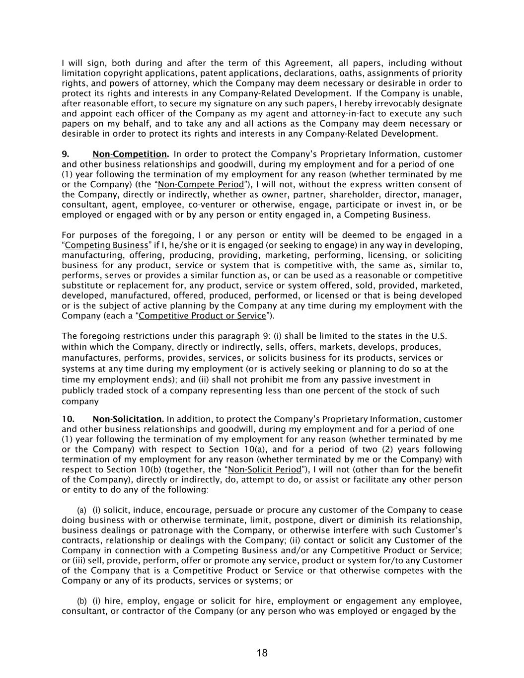 DocuSign Envelope ID: 013699B5-EA8E-4103-95BE-1461AC129709 I will sign, both during and after the term of this Agreement, all papers, including without limitation copyright applications, patent applications, declarations, oaths, assignments of priority rights, and powers of attorney, which the Company may deem necessary or desirable in order to protect its rights and interests in any Company-Related Development. If the Company is unable, after reasonable effort, to secure my signature on any such papers, I hereby irrevocably designate and appoint each officer of the Company as my agent and attorney-in-fact to execute any such papers on my behalf, and to take any and all actions as the Company may deem necessary or desirable in order to protect its rights and interests in any Company-Related Development. 9. Non-Competition. In order to protect the Company’s Proprietary Information, customer and other business relationships and goodwill, during my employment and for a period of one (1) year following the termination of my employment for any reason (whether terminated by me or the Company) (the “Non-Compete Period”), I will not, without the express written consent of the Company, directly or indirectly, whether as owner, partner, shareholder, director, manager, consultant, agent, employee, co-venturer or otherwise, engage, participate or invest in, or be employed or engaged with or by any person or entity engaged in, a Competing Business. For purposes of the foregoing, I or any person or entity will be deemed to be engaged in a “Competing Business” if I, he/she or it is engaged (or seeking to engage) in any way in developing, manufacturing, offering, producing, providing, marketing, performing, licensing, or soliciting business for any product, service or system that is competitive with, the same as, similar to, performs, serves or provides a similar function as, or can be used as a reasonable or competitive substitute or replacement for, any product, service or system offered, sold, provided, marketed, developed, manufactured, offered, produced, performed, or licensed or that is being developed or is the subject of active planning by the Company at any time during my employment with the Company (each a “Competitive Product or Service”). The foregoing restrictions under this paragraph 9: (i) shall be limited to the states in the U.S. within which the Company, directly or indirectly, sells, offers, markets, develops, produces, manufactures, performs, provides, services, or solicits business for its products, services or systems at any time during my employment (or is actively seeking or planning to do so at the time my employment ends); and (ii) shall not prohibit me from any passive investment in publicly traded stock of a company representing less than one percent of the stock of such company 10. Non-Solicitation. In addition, to protect the Company’s Proprietary Information, customer and other business relationships and goodwill, during my employment and for a period of one (1) year following the termination of my employment for any reason (whether terminated by me or the Company) with respect to Section 10(a), and for a period of two (2) years following termination of my employment for any reason (whether terminated by me or the Company) with respect to Section 10(b) (together, the “Non-Solicit Period”), I will not (other than for the benefit of the Company), directly or indirectly, do, attempt to do, or assist or facilitate any other person or entity to do any of the following: (a) (i) solicit, induce, encourage, persuade or procure any customer of the Company to cease doing business with or otherwise terminate, limit, postpone, divert or diminish its relationship, business dealings or patronage with the Company, or otherwise interfere with such Customer’s contracts, relationship or dealings with the Company; (ii) contact or solicit any Customer of the Company in connection with a Competing Business and/or any Competitive Product or Service; or (iii) sell, provide, perform, offer or promote any service, product or system for/to any Customer of the Company that is a Competitive Product or Service or that otherwise competes with the Company or any of its products, services or systems; or (b) (i) hire, employ, engage or solicit for hire, employment or engagement any employee, consultant, or contractor of the Company (or any person who was employed or engaged by the 18