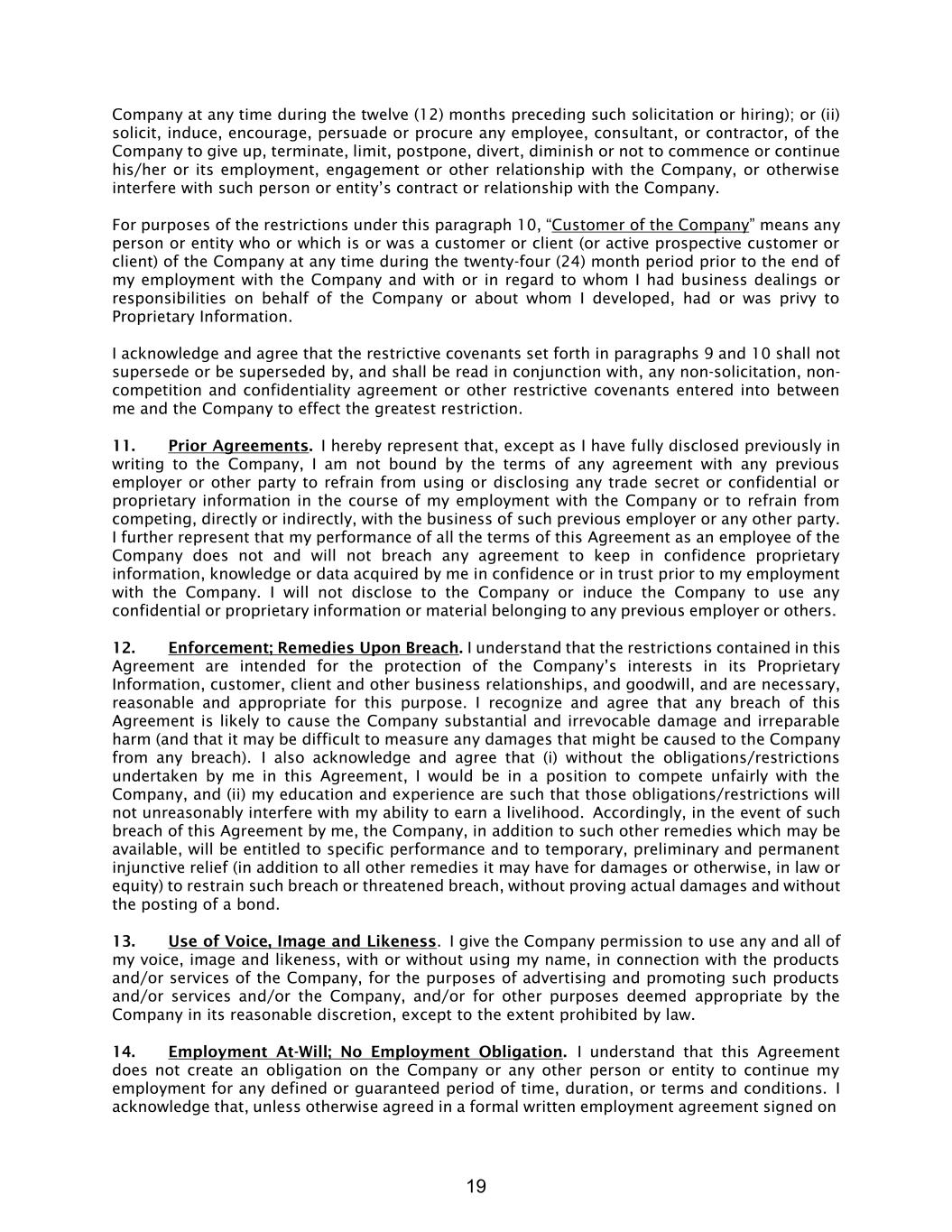 DocuSign Envelope ID: 013699B5-EA8E-4103-95BE-1461AC129709 Company at any time during the twelve (12) months preceding such solicitation or hiring); or (ii) solicit, induce, encourage, persuade or procure any employee, consultant, or contractor, of the Company to give up, terminate, limit, postpone, divert, diminish or not to commence or continue his/her or its employment, engagement or other relationship with the Company, or otherwise interfere with such person or entity’s contract or relationship with the Company. For purposes of the restrictions under this paragraph 10, “Customer of the Company” means any person or entity who or which is or was a customer or client (or active prospective customer or client) of the Company at any time during the twenty-four (24) month period prior to the end of my employment with the Company and with or in regard to whom I had business dealings or responsibilities on behalf of the Company or about whom I developed, had or was privy to Proprietary Information. I acknowledge and agree that the restrictive covenants set forth in paragraphs 9 and 10 shall not supersede or be superseded by, and shall be read in conjunction with, any non-solicitation, non- competition and confidentiality agreement or other restrictive covenants entered into between me and the Company to effect the greatest restriction. 11. Prior Agreements. I hereby represent that, except as I have fully disclosed previously in writing to the Company, I am not bound by the terms of any agreement with any previous employer or other party to refrain from using or disclosing any trade secret or confidential or proprietary information in the course of my employment with the Company or to refrain from competing, directly or indirectly, with the business of such previous employer or any other party. I further represent that my performance of all the terms of this Agreement as an employee of the Company does not and will not breach any agreement to keep in confidence proprietary information, knowledge or data acquired by me in confidence or in trust prior to my employment with the Company. I will not disclose to the Company or induce the Company to use any confidential or proprietary information or material belonging to any previous employer or others. 12. Enforcement; Remedies Upon Breach. I understand that the restrictions contained in this Agreement are intended for the protection of the Company’s interests in its Proprietary Information, customer, client and other business relationships, and goodwill, and are necessary, reasonable and appropriate for this purpose. I recognize and agree that any breach of this Agreement is likely to cause the Company substantial and irrevocable damage and irreparable harm (and that it may be difficult to measure any damages that might be caused to the Company from any breach). I also acknowledge and agree that (i) without the obligations/restrictions undertaken by me in this Agreement, I would be in a position to compete unfairly with the Company, and (ii) my education and experience are such that those obligations/restrictions will not unreasonably interfere with my ability to earn a livelihood. Accordingly, in the event of such breach of this Agreement by me, the Company, in addition to such other remedies which may be available, will be entitled to specific performance and to temporary, preliminary and permanent injunctive relief (in addition to all other remedies it may have for damages or otherwise, in law or equity) to restrain such breach or threatened breach, without proving actual damages and without the posting of a bond. 13. Use of Voice, Image and Likeness. I give the Company permission to use any and all of my voice, image and likeness, with or without using my name, in connection with the products and/or services of the Company, for the purposes of advertising and promoting such products and/or services and/or the Company, and/or for other purposes deemed appropriate by the Company in its reasonable discretion, except to the extent prohibited by law. 14. Employment At-Will; No Employment Obligation. I understand that this Agreement does not create an obligation on the Company or any other person or entity to continue my employment for any defined or guaranteed period of time, duration, or terms and conditions. I acknowledge that, unless otherwise agreed in a formal written employment agreement signed on 19
