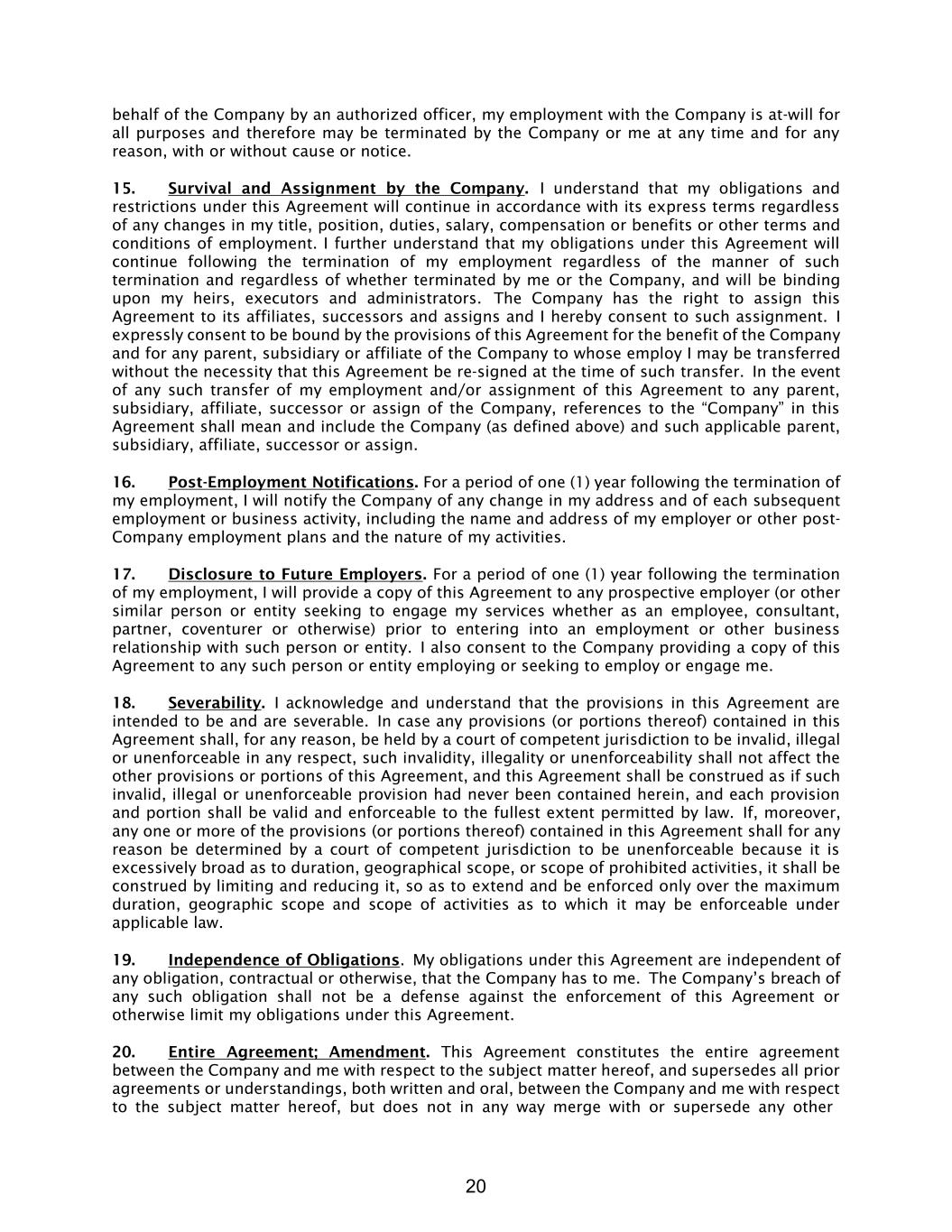 DocuSign Envelope ID: 013699B5-EA8E-4103-95BE-1461AC129709 behalf of the Company by an authorized officer, my employment with the Company is at-will for all purposes and therefore may be terminated by the Company or me at any time and for any reason, with or without cause or notice. 15. Survival and Assignment by the Company. I understand that my obligations and restrictions under this Agreement will continue in accordance with its express terms regardless of any changes in my title, position, duties, salary, compensation or benefits or other terms and conditions of employment. I further understand that my obligations under this Agreement will continue following the termination of my employment regardless of the manner of such termination and regardless of whether terminated by me or the Company, and will be binding upon my heirs, executors and administrators. The Company has the right to assign this Agreement to its affiliates, successors and assigns and I hereby consent to such assignment. I expressly consent to be bound by the provisions of this Agreement for the benefit of the Company and for any parent, subsidiary or affiliate of the Company to whose employ I may be transferred without the necessity that this Agreement be re-signed at the time of such transfer. In the event of any such transfer of my employment and/or assignment of this Agreement to any parent, subsidiary, affiliate, successor or assign of the Company, references to the “Company” in this Agreement shall mean and include the Company (as defined above) and such applicable parent, subsidiary, affiliate, successor or assign. 16. Post-Employment Notifications. For a period of one (1) year following the termination of my employment, I will notify the Company of any change in my address and of each subsequent employment or business activity, including the name and address of my employer or other post- Company employment plans and the nature of my activities. 17. Disclosure to Future Employers. For a period of one (1) year following the termination of my employment, I will provide a copy of this Agreement to any prospective employer (or other similar person or entity seeking to engage my services whether as an employee, consultant, partner, coventurer or otherwise) prior to entering into an employment or other business relationship with such person or entity. I also consent to the Company providing a copy of this Agreement to any such person or entity employing or seeking to employ or engage me. 18. Severability. I acknowledge and understand that the provisions in this Agreement are intended to be and are severable. In case any provisions (or portions thereof) contained in this Agreement shall, for any reason, be held by a court of competent jurisdiction to be invalid, illegal or unenforceable in any respect, such invalidity, illegality or unenforceability shall not affect the other provisions or portions of this Agreement, and this Agreement shall be construed as if such invalid, illegal or unenforceable provision had never been contained herein, and each provision and portion shall be valid and enforceable to the fullest extent permitted by law. If, moreover, any one or more of the provisions (or portions thereof) contained in this Agreement shall for any reason be determined by a court of competent jurisdiction to be unenforceable because it is excessively broad as to duration, geographical scope, or scope of prohibited activities, it shall be construed by limiting and reducing it, so as to extend and be enforced only over the maximum duration, geographic scope and scope of activities as to which it may be enforceable under applicable law. 19. Independence of Obligations. My obligations under this Agreement are independent of any obligation, contractual or otherwise, that the Company has to me. The Company’s breach of any such obligation shall not be a defense against the enforcement of this Agreement or otherwise limit my obligations under this Agreement. 20. Entire Agreement; Amendment. This Agreement constitutes the entire agreement between the Company and me with respect to the subject matter hereof, and supersedes all prior agreements or understandings, both written and oral, between the Company and me with respect to the subject matter hereof, but does not in any way merge with or supersede any other 20
