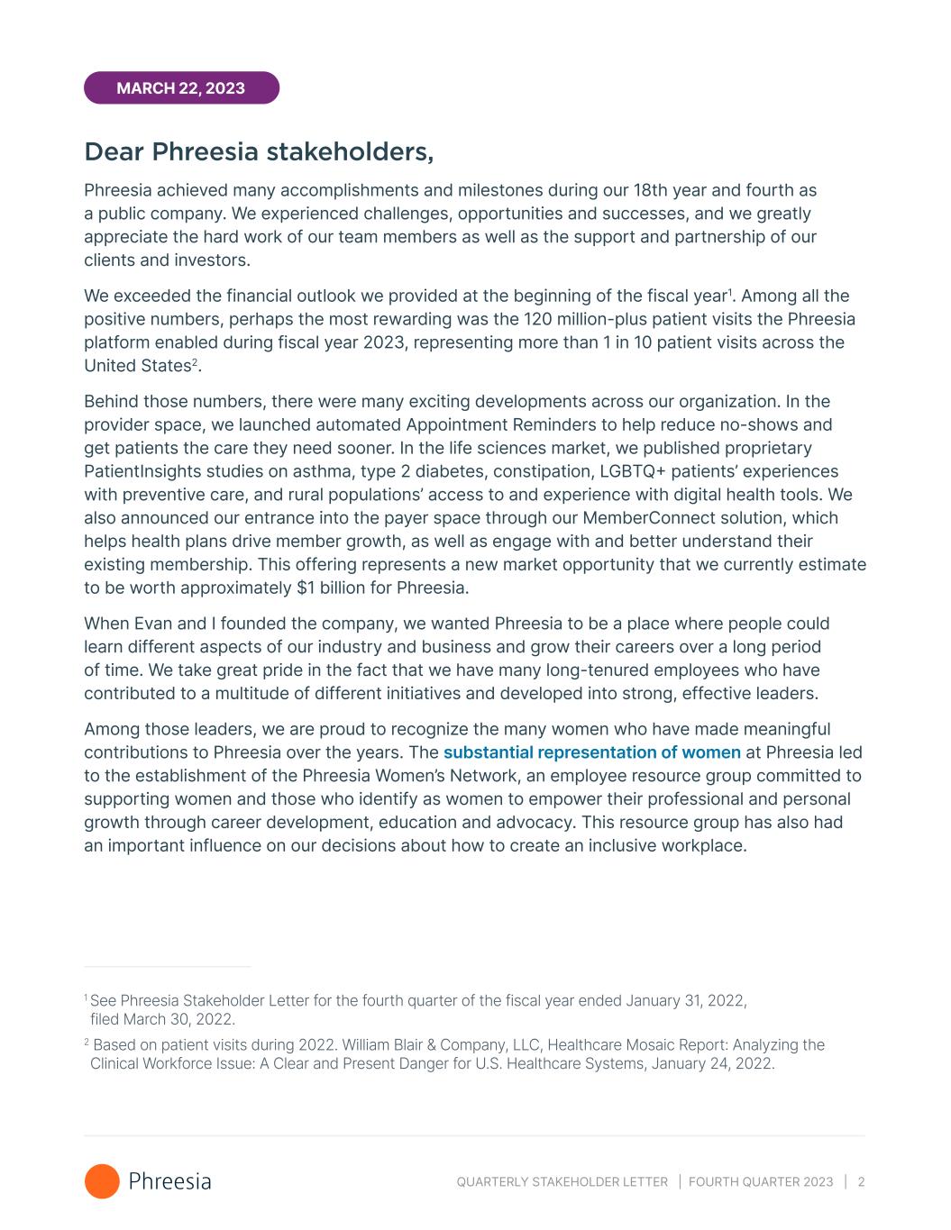 QUARTERLY STAKEHOLDER LETTER | FOURTH QUARTER 2023 | 2 Dear Phreesia stakeholders, Phreesia achieved many accomplishments and milestones during our 18th year and fourth as a public company. We experienced challenges, opportunities and successes, and we greatly appreciate the hard work of our team members as well as the support and partnership of our clients and investors. We exceeded the financial outlook we provided at the beginning of the fiscal year1. Among all the positive numbers, perhaps the most rewarding was the 120 million-plus patient visits the Phreesia platform enabled during fiscal year 2023, representing more than 1 in 10 patient visits across the United States2. Behind those numbers, there were many exciting developments across our organization. In the provider space, we launched automated Appointment Reminders to help reduce no-shows and get patients the care they need sooner. In the life sciences market, we published proprietary PatientInsights studies on asthma, type 2 diabetes, constipation, LGBTQ+ patients’ experiences with preventive care, and rural populations’ access to and experience with digital health tools. We also announced our entrance into the payer space through our MemberConnect solution, which helps health plans drive member growth, as well as engage with and better understand their existing membership. This offering represents a new market opportunity that we currently estimate to be worth approximately $1 billion for Phreesia. When Evan and I founded the company, we wanted Phreesia to be a place where people could learn different aspects of our industry and business and grow their careers over a long period of time. We take great pride in the fact that we have many long-tenured employees who have contributed to a multitude of different initiatives and developed into strong, effective leaders. Among those leaders, we are proud to recognize the many women who have made meaningful contributions to Phreesia over the years. The substantial representation of women at Phreesia led to the establishment of the Phreesia Women’s Network, an employee resource group committed to supporting women and those who identify as women to empower their professional and personal growth through career development, education and advocacy. This resource group has also had an important influence on our decisions about how to create an inclusive workplace. MARCH 22, 2023 1 See Phreesia Stakeholder Letter for the fourth quarter of the fiscal year ended January 31, 2022, filed March 30, 2022. 2 Based on patient visits during 2022. William Blair & Company, LLC, Healthcare Mosaic Report: Analyzing the Clinical Workforce Issue: A Clear and Present Danger for U.S. Healthcare Systems, January 24, 2022.