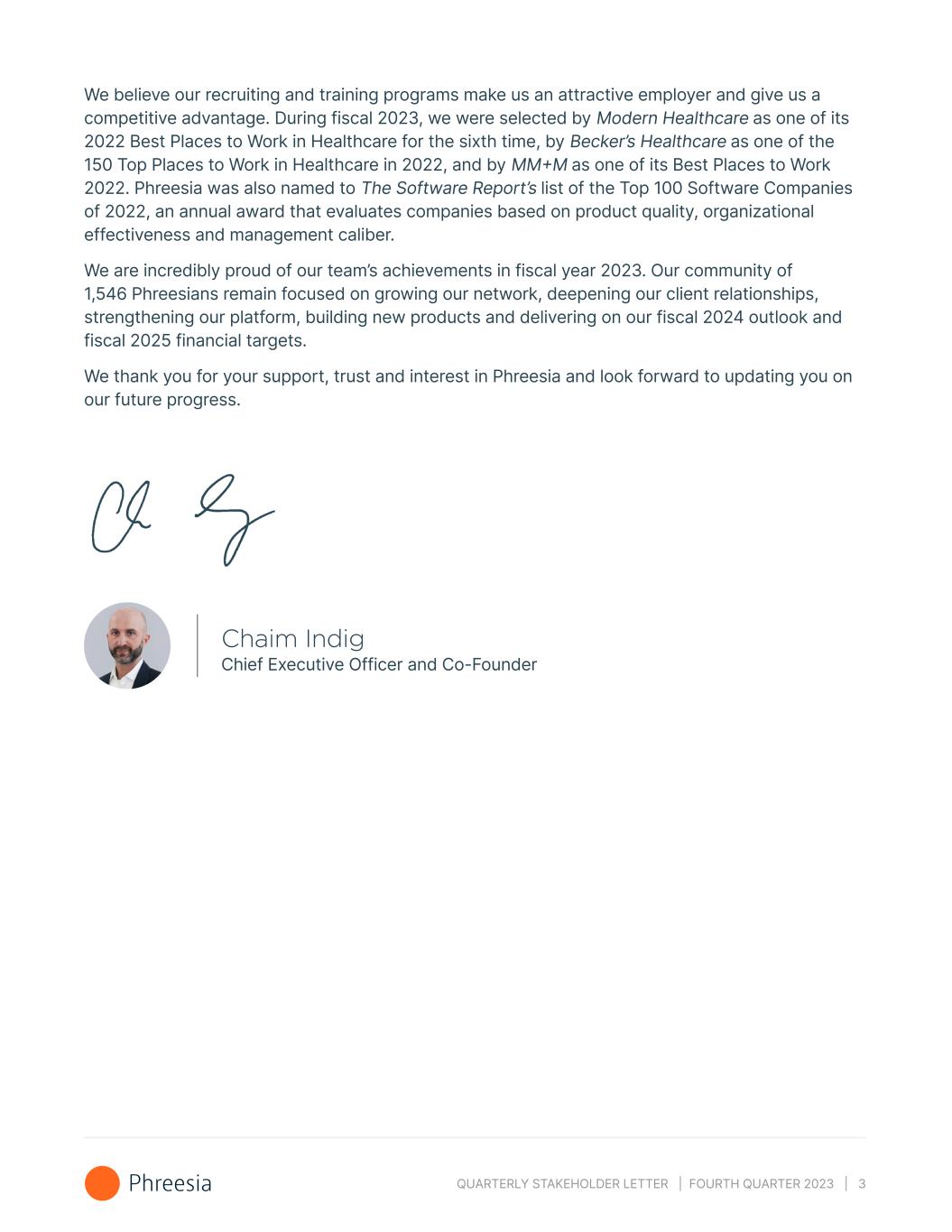 QUARTERLY STAKEHOLDER LETTER | FOURTH QUARTER 2023 | 3 We believe our recruiting and training programs make us an attractive employer and give us a competitive advantage. During fiscal 2023, we were selected by Modern Healthcare as one of its 2022 Best Places to Work in Healthcare for the sixth time, by Becker’s Healthcare as one of the 150 Top Places to Work in Healthcare in 2022, and by MM+M as one of its Best Places to Work 2022. Phreesia was also named to The Software Report’s list of the Top 100 Software Companies of 2022, an annual award that evaluates companies based on product quality, organizational effectiveness and management caliber. We are incredibly proud of our team’s achievements in fiscal year 2023. Our community of 1,546 Phreesians remain focused on growing our network, deepening our client relationships, strengthening our platform, building new products and delivering on our fiscal 2024 outlook and fiscal 2025 financial targets. We thank you for your support, trust and interest in Phreesia and look forward to updating you on our future progress. Chaim Indig Chief Executive Officer and Co-Founder