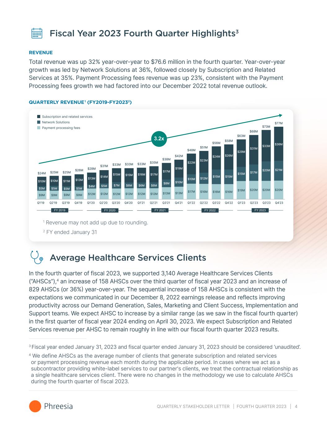 QUARTERLY STAKEHOLDER LETTER | FOURTH QUARTER 2023 | 4 Fiscal Year 2023 Fourth Quarter Highlights3 REVENUE Total revenue was up 32% year-over-year to $76.6 million in the fourth quarter. Year-over-year growth was led by Network Solutions at 36%, followed closely by Subscription and Related Services at 35%. Payment Processing fees revenue was up 23%, consistent with the Payment Processing fees growth we had factored into our December 2022 total revenue outlook. QUARTERLY REVENUE1 (FY2019-FY20232) Q1’19 Q2’19 Q3’19 Q4’19 Q1’20 Q2’20 Q3’20 Q4’20 Q1’21 Q2’21 Q3’21 Q4’21 Q1’22 Q2’22 Q3’22 Q4’22 Q1’23 Q2’23 Q3’23 Q4’23 Subscription and related services Payment processing fees Network Solutions $10M $10M $11M $13M $13M $14M $15M $15M $16M $17M $17M $19M $22M $23M $24M $26M $29M $31M $33M $9M $9M $9M $9M $12M $12M $12M $12M $12M $12M $13M $13M $16M$17M $16M $16M $19M $20M $20M $5M $5M $5M $5M $4M $5M $7M $6M $6M $6M $8M $12M $10M $10M $15M $15M $15M $17M $20M $24M $25M $25M $26M $28M $31M $33M $33M $33M $35M $38M $42M $48M $51M $56M $58M $63M $68M $73M $36M $21M $20M $77M 1 Revenue may not add up due to rounding. 2 FY ended January 31 Average Healthcare Services Clients In the fourth quarter of fiscal 2023, we supported 3,140 Average Healthcare Services Clients (“AHSCs”),4 an increase of 158 AHSCs over the third quarter of fiscal year 2023 and an increase of 829 AHSCs (or 36%) year-over-year. The sequential increase of 158 AHSCs is consistent with the expectations we communicated in our December 8, 2022 earnings release and reflects improving productivity across our Demand Generation, Sales, Marketing and Client Success, Implementation and Support teams. We expect AHSC to increase by a similar range (as we saw in the fiscal fourth quarter) in the first quarter of fiscal year 2024 ending on April 30, 2023. We expect Subscription and Related Services revenue per AHSC to remain roughly in line with our fiscal fourth quarter 2023 results. 3 Fiscal year ended January 31, 2023 and fiscal quarter ended January 31, 2023 should be considered ‘unaudited’. 4 We define AHSCs as the average number of clients that generate subscription and related services or payment processing revenue each month during the applicable period. In cases where we act as a subcontractor providing white-label services to our partner's clients, we treat the contractual relationship as a single healthcare services client. There were no changes in the methodology we use to calculate AHSCs during the fourth quarter of fiscal 2023.
