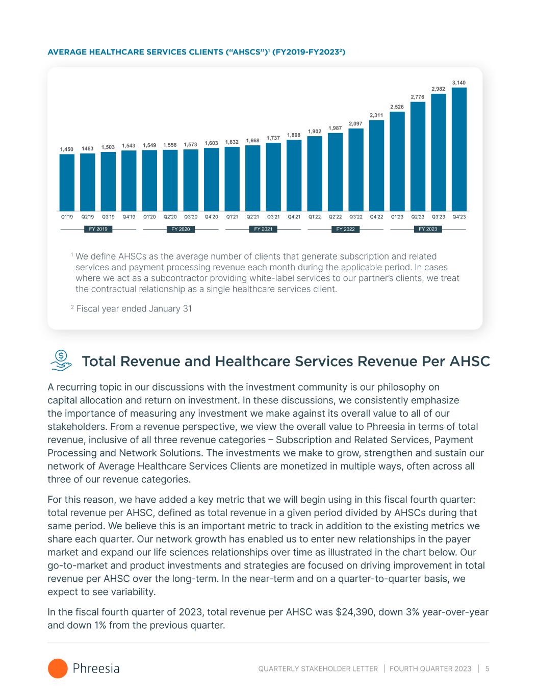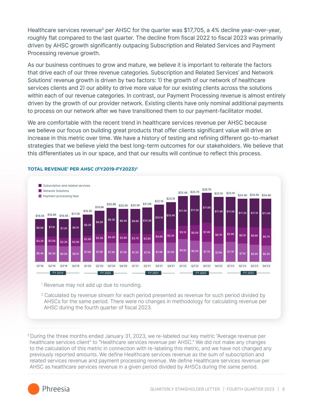 QUARTERLY STAKEHOLDER LETTER | FOURTH QUARTER 2023 | 5 AVERAGE HEALTHCARE SERVICES CLIENTS (“AHSCS”)1 (FY2019-FY20232) Q1’19 Q2’19 Q3’19 Q4’19 Q1’20 Q2’20 Q3’20 Q4’20 Q1’21 Q2’21 Q3’21 Q4’21 Q1’22 Q2’22 Q3’22 Q4’22 Q1’23 Q2’23 Q3’23 Q4’23 1 We define AHSCs as the average number of clients that generate subscription and related services and payment processing revenue each month during the applicable period. In cases where we act as a subcontractor providing white-label services to our partner’s clients, we treat the contractual relationship as a single healthcare services client. 2 Fiscal year ended January 31 Total Revenue and Healthcare Services Revenue Per AHSC A recurring topic in our discussions with the investment community is our philosophy on capital allocation and return on investment. In these discussions, we consistently emphasize the importance of measuring any investment we make against its overall value to all of our stakeholders. From a revenue perspective, we view the overall value to Phreesia in terms of total revenue, inclusive of all three revenue categories – Subscription and Related Services, Payment Processing and Network Solutions. The investments we make to grow, strengthen and sustain our network of Average Healthcare Services Clients are monetized in multiple ways, often across all three of our revenue categories. For this reason, we have added a key metric that we will begin using in this fiscal fourth quarter: total revenue per AHSC, defined as total revenue in a given period divided by AHSCs during that same period. We believe this is an important metric to track in addition to the existing metrics we share each quarter. Our network growth has enabled us to enter new relationships in the payer market and expand our life sciences relationships over time as illustrated in the chart below. Our go-to-market and product investments and strategies are focused on driving improvement in total revenue per AHSC over the long-term. In the near-term and on a quarter-to-quarter basis, we expect to see variability. In the fiscal fourth quarter of 2023, total revenue per AHSC was $24,390, down 3% year-over-year and down 1% from the previous quarter.