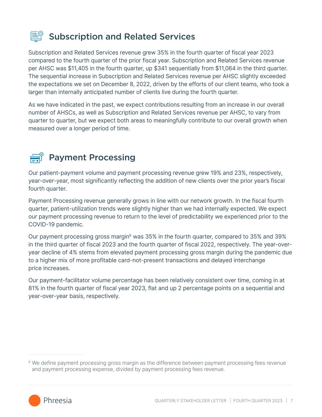 QUARTERLY STAKEHOLDER LETTER | FOURTH QUARTER 2023 | 7 Subscription and Related Services Subscription and Related Services revenue grew 35% in the fourth quarter of fiscal year 2023 compared to the fourth quarter of the prior fiscal year. Subscription and Related Services revenue per AHSC was $11,405 in the fourth quarter, up $341 sequentially from $11,064 in the third quarter. The sequential increase in Subscription and Related Services revenue per AHSC slightly exceeded the expectations we set on December 8, 2022, driven by the efforts of our client teams, who took a larger than internally anticipated number of clients live during the fourth quarter. As we have indicated in the past, we expect contributions resulting from an increase in our overall number of AHSCs, as well as Subscription and Related Services revenue per AHSC, to vary from quarter to quarter, but we expect both areas to meaningfully contribute to our overall growth when measured over a longer period of time. Payment Processing Our patient-payment volume and payment processing revenue grew 19% and 23%, respectively, year-over-year, most significantly reflecting the addition of new clients over the prior year’s fiscal fourth quarter. Payment Processing revenue generally grows in line with our network growth. In the fiscal fourth quarter, patient-utilization trends were slightly higher than we had internally expected. We expect our payment processing revenue to return to the level of predictability we experienced prior to the COVID-19 pandemic. Our payment processing gross margin6 was 35% in the fourth quarter, compared to 35% and 39% in the third quarter of fiscal 2023 and the fourth quarter of fiscal 2022, respectively. The year-over- year decline of 4% stems from elevated payment processing gross margin during the pandemic due to a higher mix of more profitable card-not-present transactions and delayed interchange price increases. Our payment-facilitator volume percentage has been relatively consistent over time, coming in at 81% in the fourth quarter of fiscal year 2023, flat and up 2 percentage points on a sequential and year-over-year basis, respectively. 6 We define payment processing gross margin as the difference between payment processing fees revenue and payment processing expense, divided by payment processing fees revenue.