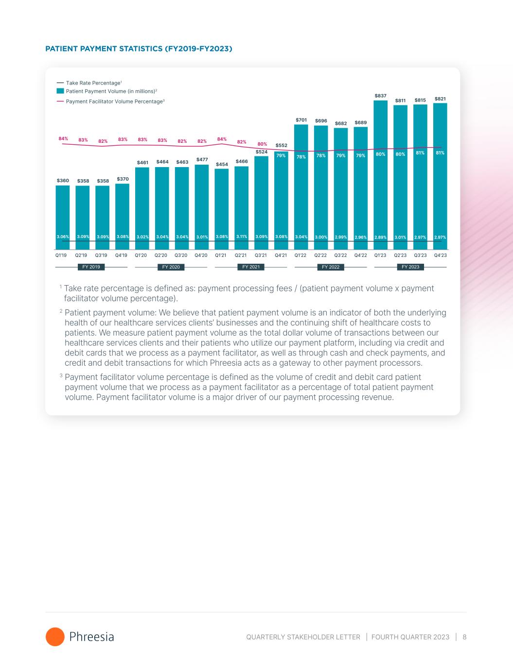 QUARTERLY STAKEHOLDER LETTER | FOURTH QUARTER 2023 | 8 PATIENT PAYMENT STATISTICS (FY2019-FY2023) Q1’19 Q2’19 Q3’19 Q4’19 Q1’20 Q2’20 Q3’20 Q4’20 Q1’21 Q2’21 Q3’21 Q4’21 Q1’22 Q2’22 Q3’22 Q4’22 Q1’23 Q2’23 Q3’23 Q4’23 Payment Facilitator Volume Percentage3 Take Rate Percentage1 Patient Payment Volume (in millions)2 $360 $358 $358 $370 $461 $464 $463 $477 $454 $466 $524 $552 $701 $696 $682 $689 $837 $811 $815 3.06% 3.09% 3.09% 3.08% 3.02% 3.04% 3.04% 3.01% 3.08% 3.11% 3.09% 3.08% 3.04% 3.00% 2.99% 2.96% 2.89% 3.01% 2.97% $821 2.97% 81% 81% 80%82%84%82%82%83%83%83%82%83%84% 80%80%79%79%78%78%79% 1 Take rate percentage is defined as: payment processing fees / (patient payment volume x payment facilitator volume percentage). 2 Patient payment volume: We believe that patient payment volume is an indicator of both the underlying health of our healthcare services clients’ businesses and the continuing shift of healthcare costs to patients. We measure patient payment volume as the total dollar volume of transactions between our healthcare services clients and their patients who utilize our payment platform, including via credit and debit cards that we process as a payment facilitator, as well as through cash and check payments, and credit and debit transactions for which Phreesia acts as a gateway to other payment processors. 3 Payment facilitator volume percentage is defined as the volume of credit and debit card patient payment volume that we process as a payment facilitator as a percentage of total patient payment volume. Payment facilitator volume is a major driver of our payment processing revenue.