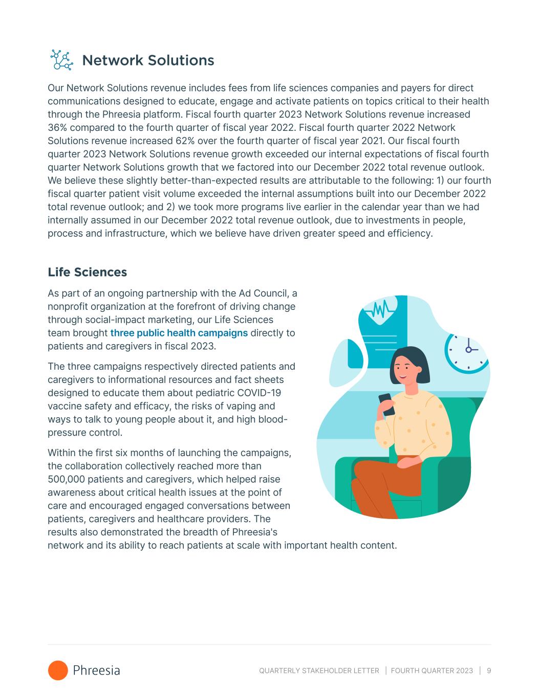 QUARTERLY STAKEHOLDER LETTER | FOURTH QUARTER 2023 | 9 Network Solutions Our Network Solutions revenue includes fees from life sciences companies and payers for direct communications designed to educate, engage and activate patients on topics critical to their health through the Phreesia platform. Fiscal fourth quarter 2023 Network Solutions revenue increased 36% compared to the fourth quarter of fiscal year 2022. Fiscal fourth quarter 2022 Network Solutions revenue increased 62% over the fourth quarter of fiscal year 2021. Our fiscal fourth quarter 2023 Network Solutions revenue growth exceeded our internal expectations of fiscal fourth quarter Network Solutions growth that we factored into our December 2022 total revenue outlook. We believe these slightly better-than-expected results are attributable to the following: 1) our fourth fiscal quarter patient visit volume exceeded the internal assumptions built into our December 2022 total revenue outlook; and 2) we took more programs live earlier in the calendar year than we had internally assumed in our December 2022 total revenue outlook, due to investments in people, process and infrastructure, which we believe have driven greater speed and efficiency. Life Sciences As part of an ongoing partnership with the Ad Council, a nonprofit organization at the forefront of driving change through social-impact marketing, our Life Sciences team brought three public health campaigns directly to patients and caregivers in fiscal 2023. The three campaigns respectively directed patients and caregivers to informational resources and fact sheets designed to educate them about pediatric COVID-19 vaccine safety and efficacy, the risks of vaping and ways to talk to young people about it, and high blood- pressure control. Within the first six months of launching the campaigns, the collaboration collectively reached more than 500,000 patients and caregivers, which helped raise awareness about critical health issues at the point of care and encouraged engaged conversations between patients, caregivers and healthcare providers. The results also demonstrated the breadth of Phreesia's network and its ability to reach patients at scale with important health content.