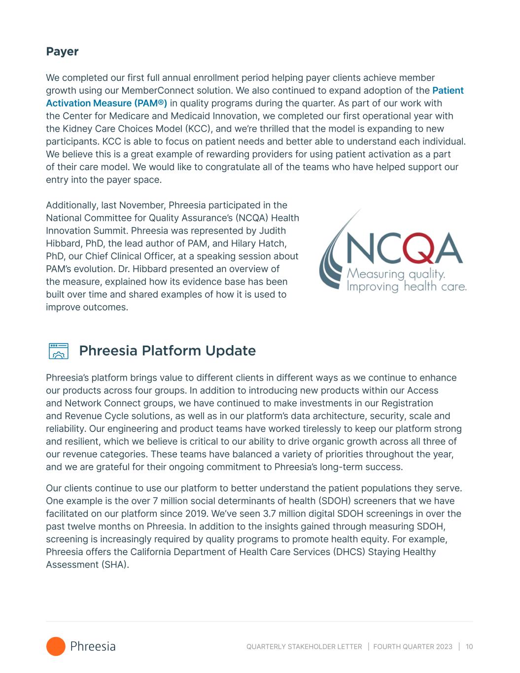 QUARTERLY STAKEHOLDER LETTER | FOURTH QUARTER 2023 | 10 Payer We completed our first full annual enrollment period helping payer clients achieve member growth using our MemberConnect solution. We also continued to expand adoption of the Patient Activation Measure (PAM®) in quality programs during the quarter. As part of our work with the Center for Medicare and Medicaid Innovation, we completed our first operational year with the Kidney Care Choices Model (KCC), and we’re thrilled that the model is expanding to new participants. KCC is able to focus on patient needs and better able to understand each individual. We believe this is a great example of rewarding providers for using patient activation as a part of their care model. We would like to congratulate all of the teams who have helped support our entry into the payer space. Additionally, last November, Phreesia participated in the National Committee for Quality Assurance’s (NCQA) Health Innovation Summit. Phreesia was represented by Judith Hibbard, PhD, the lead author of PAM, and Hilary Hatch, PhD, our Chief Clinical Officer, at a speaking session about PAM’s evolution. Dr. Hibbard presented an overview of the measure, explained how its evidence base has been built over time and shared examples of how it is used to improve outcomes. Phreesia Platform Update Phreesia’s platform brings value to different clients in different ways as we continue to enhance our products across four groups. In addition to introducing new products within our Access and Network Connect groups, we have continued to make investments in our Registration and Revenue Cycle solutions, as well as in our platform’s data architecture, security, scale and reliability. Our engineering and product teams have worked tirelessly to keep our platform strong and resilient, which we believe is critical to our ability to drive organic growth across all three of our revenue categories. These teams have balanced a variety of priorities throughout the year, and we are grateful for their ongoing commitment to Phreesia’s long-term success. Our clients continue to use our platform to better understand the patient populations they serve. One example is the over 7 million social determinants of health (SDOH) screeners that we have facilitated on our platform since 2019. We’ve seen 3.7 million digital SDOH screenings in over the past twelve months on Phreesia. In addition to the insights gained through measuring SDOH, screening is increasingly required by quality programs to promote health equity. For example, Phreesia offers the California Department of Health Care Services (DHCS) Staying Healthy Assessment (SHA).