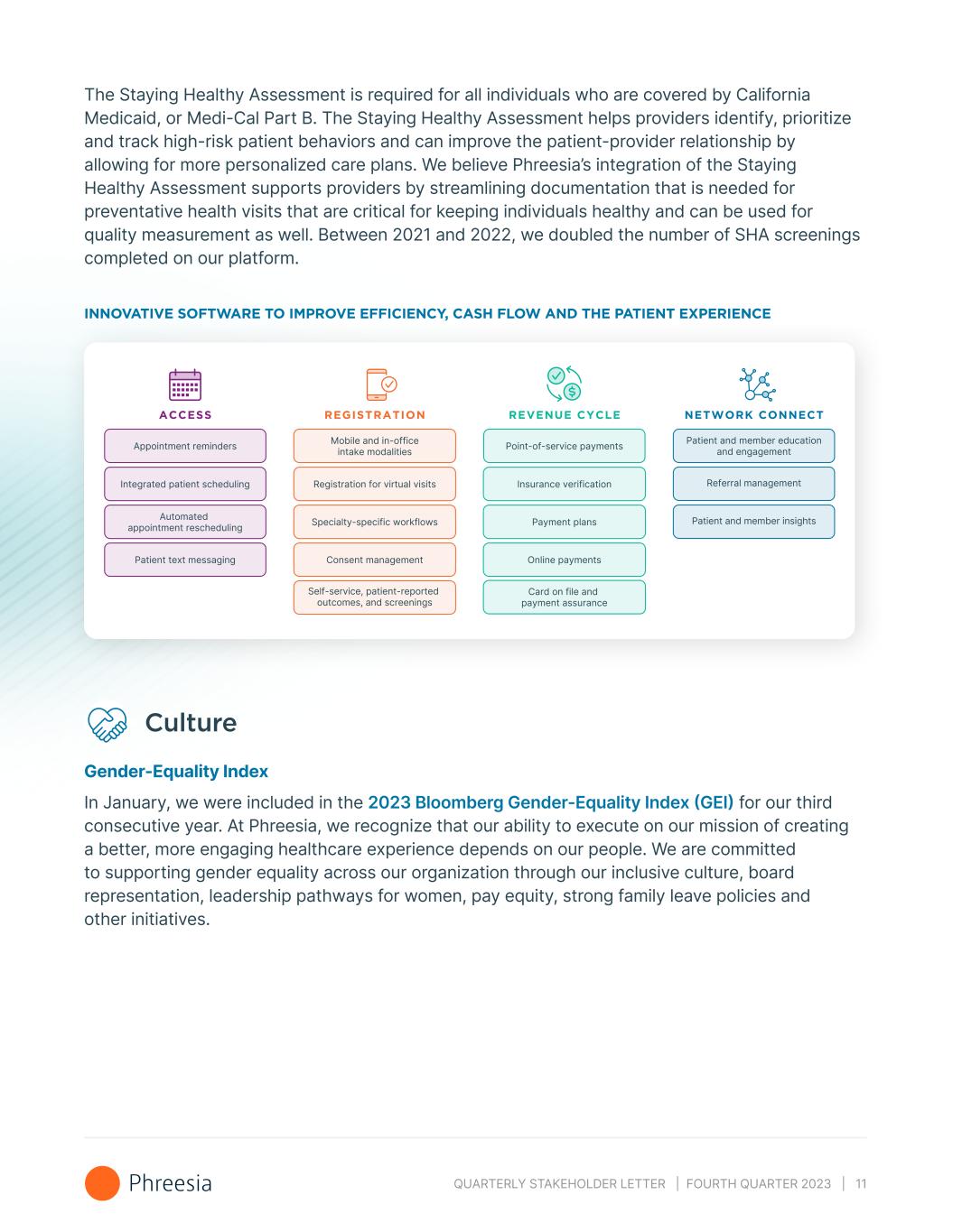 QUARTERLY STAKEHOLDER LETTER | FOURTH QUARTER 2023 | 11 The Staying Healthy Assessment is required for all individuals who are covered by California Medicaid, or Medi-Cal Part B. The Staying Healthy Assessment helps providers identify, prioritize and track high-risk patient behaviors and can improve the patient-provider relationship by allowing for more personalized care plans. We believe Phreesia’s integration of the Staying Healthy Assessment supports providers by streamlining documentation that is needed for preventative health visits that are critical for keeping individuals healthy and can be used for quality measurement as well. Between 2021 and 2022, we doubled the number of SHA screenings completed on our platform. INNOVATIVE SOFTWARE TO IMPROVE EFFICIENCY, CASH FLOW AND THE PATIENT EXPERIENCE Mobile and in-office intake modalitiesAppointment reminders Point-of-service payments Insurance verification Card on file and payment assurance Payment plans Online payments Specialty-specific workflows Registration for virtual visits Consent management Self-service, patient-reported outcomes, and screenings Patient and member education and engagement Referral management Patient and member insights Integrated patient scheduling Automated appointment rescheduling ACCESS REGISTRATION REVENUE CYCLE NETWORK CONNECT Patient text messaging Culture Gender-Equality Index In January, we were included in the 2023 Bloomberg Gender-Equality Index (GEI) for our third consecutive year. At Phreesia, we recognize that our ability to execute on our mission of creating a better, more engaging healthcare experience depends on our people. We are committed to supporting gender equality across our organization through our inclusive culture, board representation, leadership pathways for women, pay equity, strong family leave policies and other initiatives.