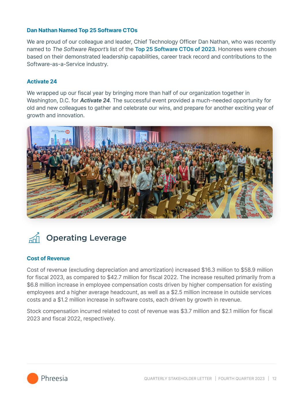 QUARTERLY STAKEHOLDER LETTER | FOURTH QUARTER 2023 | 12 Dan Nathan Named Top 25 Software CTOs We are proud of our colleague and leader, Chief Technology Officer Dan Nathan, who was recently named to The Software Report’s list of the Top 25 Software CTOs of 2023. Honorees were chosen based on their demonstrated leadership capabilities, career track record and contributions to the Software-as-a-Service industry. Activate 24 We wrapped up our fiscal year by bringing more than half of our organization together in Washington, D.C. for Activate 24. The successful event provided a much-needed opportunity for old and new colleagues to gather and celebrate our wins, and prepare for another exciting year of growth and innovation. Operating Leverage Cost of Revenue Cost of revenue (excluding depreciation and amortization) increased $16.3 million to $58.9 million for fiscal 2023, as compared to $42.7 million for fiscal 2022. The increase resulted primarily from a $6.8 million increase in employee compensation costs driven by higher compensation for existing employees and a higher average headcount, as well as a $2.5 million increase in outside services costs and a $1.2 million increase in software costs, each driven by growth in revenue. Stock compensation incurred related to cost of revenue was $3.7 million and $2.1 million for fiscal 2023 and fiscal 2022, respectively.