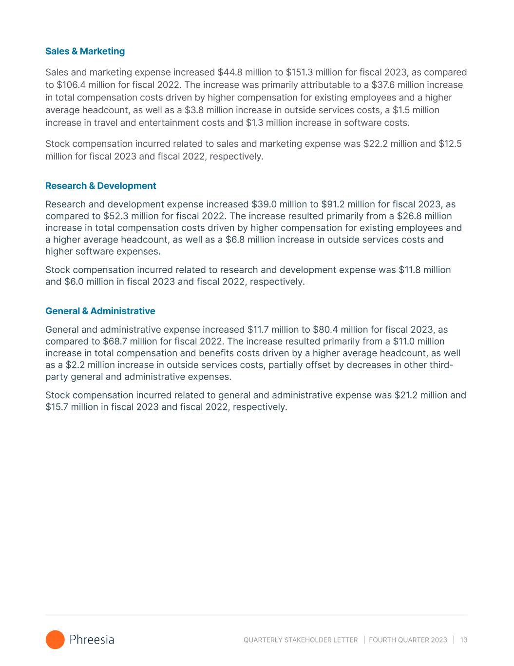 QUARTERLY STAKEHOLDER LETTER | FOURTH QUARTER 2023 | 13 Sales & Marketing Sales and marketing expense increased $44.8 million to $151.3 million for fiscal 2023, as compared to $106.4 million for fiscal 2022. The increase was primarily attributable to a $37.6 million increase in total compensation costs driven by higher compensation for existing employees and a higher average headcount, as well as a $3.8 million increase in outside services costs, a $1.5 million increase in travel and entertainment costs and $1.3 million increase in software costs. Stock compensation incurred related to sales and marketing expense was $22.2 million and $12.5 million for fiscal 2023 and fiscal 2022, respectively. Research & Development Research and development expense increased $39.0 million to $91.2 million for fiscal 2023, as compared to $52.3 million for fiscal 2022. The increase resulted primarily from a $26.8 million increase in total compensation costs driven by higher compensation for existing employees and a higher average headcount, as well as a $6.8 million increase in outside services costs and higher software expenses. Stock compensation incurred related to research and development expense was $11.8 million and $6.0 million in fiscal 2023 and fiscal 2022, respectively. General & Administrative General and administrative expense increased $11.7 million to $80.4 million for fiscal 2023, as compared to $68.7 million for fiscal 2022. The increase resulted primarily from a $11.0 million increase in total compensation and benefits costs driven by a higher average headcount, as well as a $2.2 million increase in outside services costs, partially offset by decreases in other third- party general and administrative expenses. Stock compensation incurred related to general and administrative expense was $21.2 million and $15.7 million in fiscal 2023 and fiscal 2022, respectively.
