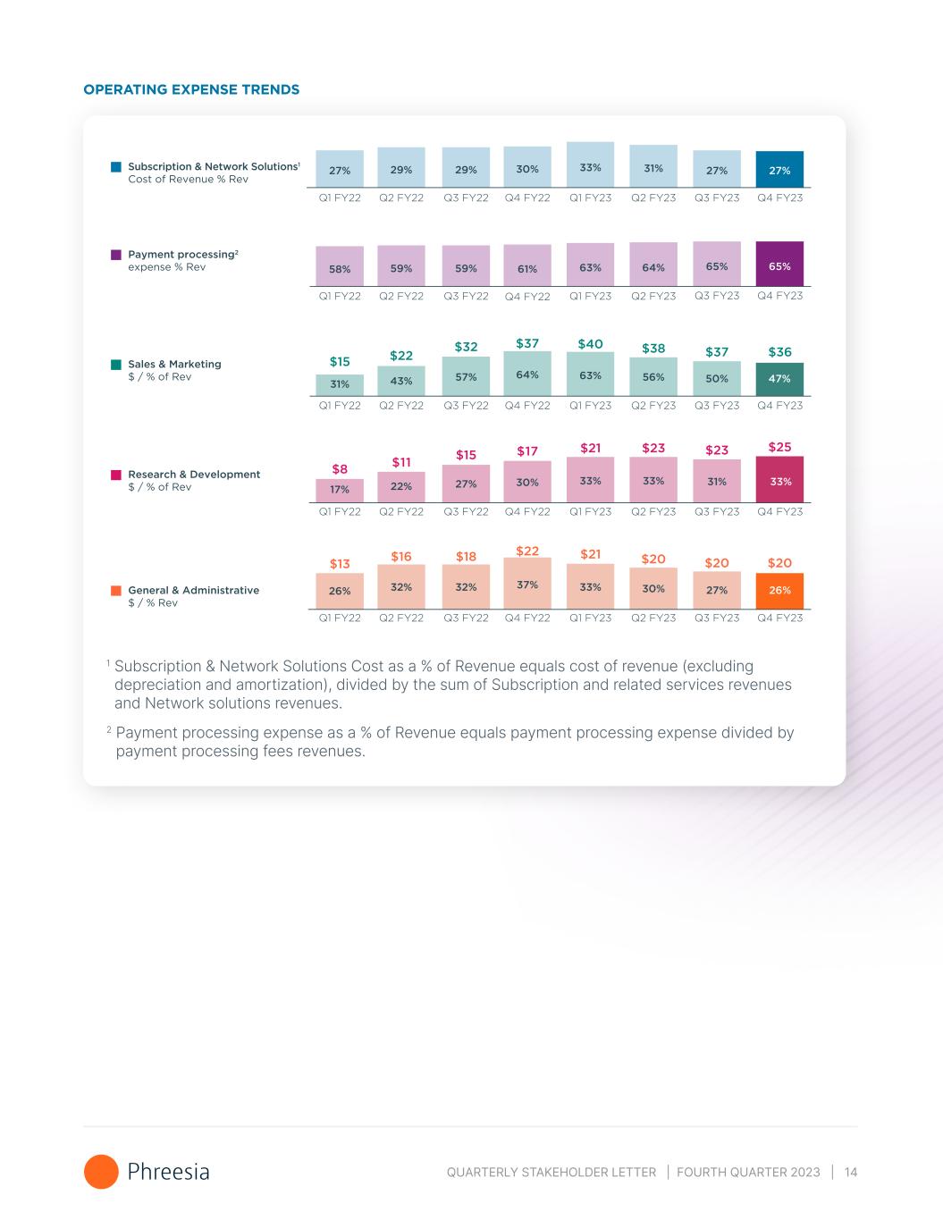 QUARTERLY STAKEHOLDER LETTER | FOURTH QUARTER 2023 | 14 OPERATING EXPENSE TRENDS 27% 29% 29% 30% 33% 31% 27%Subscription & Network Solutions1 Cost of Revenue % Rev Q1 FY22 Q2 FY22 Q3 FY22 Q4 FY22 Q1 FY23 Q2 FY23 Q3 FY23 Q4 FY23 Q4 FY23 Q4 FY23 Q4 FY23 Q4 FY23 58% 59% 59% 61% 63% 64% 65% Payment processing2 expense % Rev Q1 FY22 Q2 FY22 Q3 FY22 Q4 FY22 Q1 FY23 Q2 FY23 Q3 FY23 Sales & Marketing $ / % of Rev Q1 FY22 Q2 FY22 Q3 FY22 Q4 FY22 Q1 FY23 Q2 FY23 Q3 FY23 31% 43% 57% 64% 63% 56% 50% $15 $22 $32 $37 $40 $38 $37 17% 22% 27% 30% 33% 33% 31% Research & Development $ / % of Rev Q1 FY22 Q2 FY22 Q3 FY22 Q4 FY22 Q1 FY23 Q2 FY23 Q3 FY23 $8 $11 $15 $17 $21 $23 $23 26% 32% 32% 37% 33% 30% 27%General & Administrative $ / % Rev Q1 FY22 Q2 FY22 Q3 FY22 Q4 FY22 Q1 FY23 Q2 FY23 Q3 FY23 $13 $16 $18 $22 $21 $20 $20 27% 65% 47% $36 33% $25 26% $20 1 Subscription & Network Solutions Cost as a % of Revenue equals cost of revenue (excluding depreciation and amortization), divided by the sum of Subscription and related services revenues and Network solutions revenues. 2 Payment processing expense as a % of Revenue equals payment processing expense divided by payment processing fees revenues.