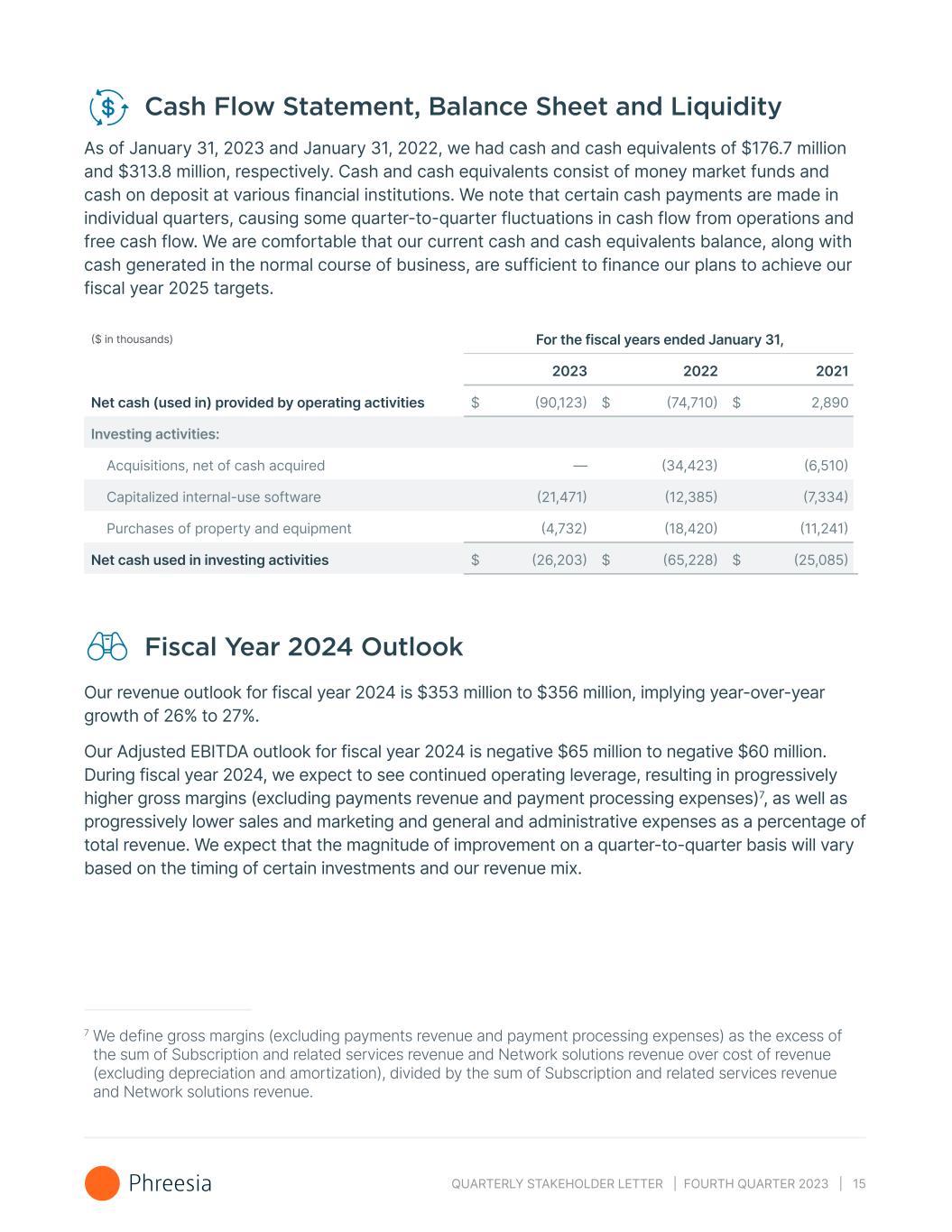 QUARTERLY STAKEHOLDER LETTER | FOURTH QUARTER 2023 | 15 Cash Flow Statement, Balance Sheet and Liquidity As of January 31, 2023 and January 31, 2022, we had cash and cash equivalents of $176.7 million and $313.8 million, respectively. Cash and cash equivalents consist of money market funds and cash on deposit at various financial institutions. We note that certain cash payments are made in individual quarters, causing some quarter-to-quarter fluctuations in cash flow from operations and free cash flow. We are comfortable that our current cash and cash equivalents balance, along with cash generated in the normal course of business, are sufficient to finance our plans to achieve our fiscal year 2025 targets. ($ in thousands) For the fiscal years ended January 31, 2023 2022 2021 Net cash (used in) provided by operating activities $ (90,123) $ (74,710) $ 2,890 Investing activities: Acquisitions, net of cash acquired — (34,423) (6,510) Capitalized internal-use software (21,471) (12,385) (7,334) Purchases of property and equipment (4,732) (18,420) (11,241) Net cash used in investing activities $ (26,203) $ (65,228) $ (25,085) Fiscal Year 2024 Outlook Our revenue outlook for fiscal year 2024 is $353 million to $356 million, implying year-over-year growth of 26% to 27%. Our Adjusted EBITDA outlook for fiscal year 2024 is negative $65 million to negative $60 million. During fiscal year 2024, we expect to see continued operating leverage, resulting in progressively higher gross margins (excluding payments revenue and payment processing expenses)7, as well as progressively lower sales and marketing and general and administrative expenses as a percentage of total revenue. We expect that the magnitude of improvement on a quarter-to-quarter basis will vary based on the timing of certain investments and our revenue mix. 7 We define gross margins (excluding payments revenue and payment processing expenses) as the excess of the sum of Subscription and related services revenue and Network solutions revenue over cost of revenue (excluding depreciation and amortization), divided by the sum of Subscription and related services revenue and Network solutions revenue.