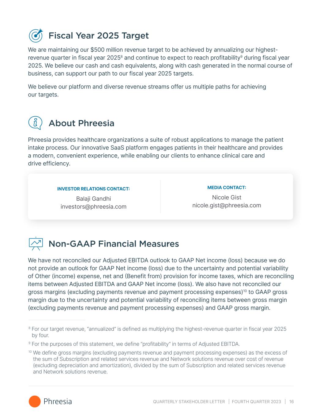 QUARTERLY STAKEHOLDER LETTER | FOURTH QUARTER 2023 | 16 Fiscal Year 2025 Target We are maintaining our $500 million revenue target to be achieved by annualizing our highest- revenue quarter in fiscal year 20258 and continue to expect to reach profitability9 during fiscal year 2025. We believe our cash and cash equivalents, along with cash generated in the normal course of business, can support our path to our fiscal year 2025 targets. We believe our platform and diverse revenue streams offer us multiple paths for achieving our targets. About Phreesia Phreesia provides healthcare organizations a suite of robust applications to manage the patient intake process. Our innovative SaaS platform engages patients in their healthcare and provides a modern, convenient experience, while enabling our clients to enhance clinical care and drive efficiency. INVESTOR RELATIONS CONTACT: Balaji Gandhi investors@phreesia.com MEDIA CONTACT: Nicole Gist nicole.gist@phreesia.com Non-GAAP Financial Measures We have not reconciled our Adjusted EBITDA outlook to GAAP Net income (loss) because we do not provide an outlook for GAAP Net income (loss) due to the uncertainty and potential variability of Other (income) expense, net and (Benefit from) provision for income taxes, which are reconciling items between Adjusted EBITDA and GAAP Net income (loss). We also have not reconciled our gross margins (excluding payments revenue and payment processing expenses)10 to GAAP gross margin due to the uncertainty and potential variability of reconciling items between gross margin (excluding payments revenue and payment processing expenses) and GAAP gross margin. 8 For our target revenue, “annualized” is defined as multiplying the highest-revenue quarter in fiscal year 2025 by four. 9 For the purposes of this statement, we define “profitability” in terms of Adjusted EBITDA. 10 We define gross margins (excluding payments revenue and payment processing expenses) as the excess of the sum of Subscription and related services revenue and Network solutions revenue over cost of revenue (excluding depreciation and amortization), divided by the sum of Subscription and related services revenue and Network solutions revenue.