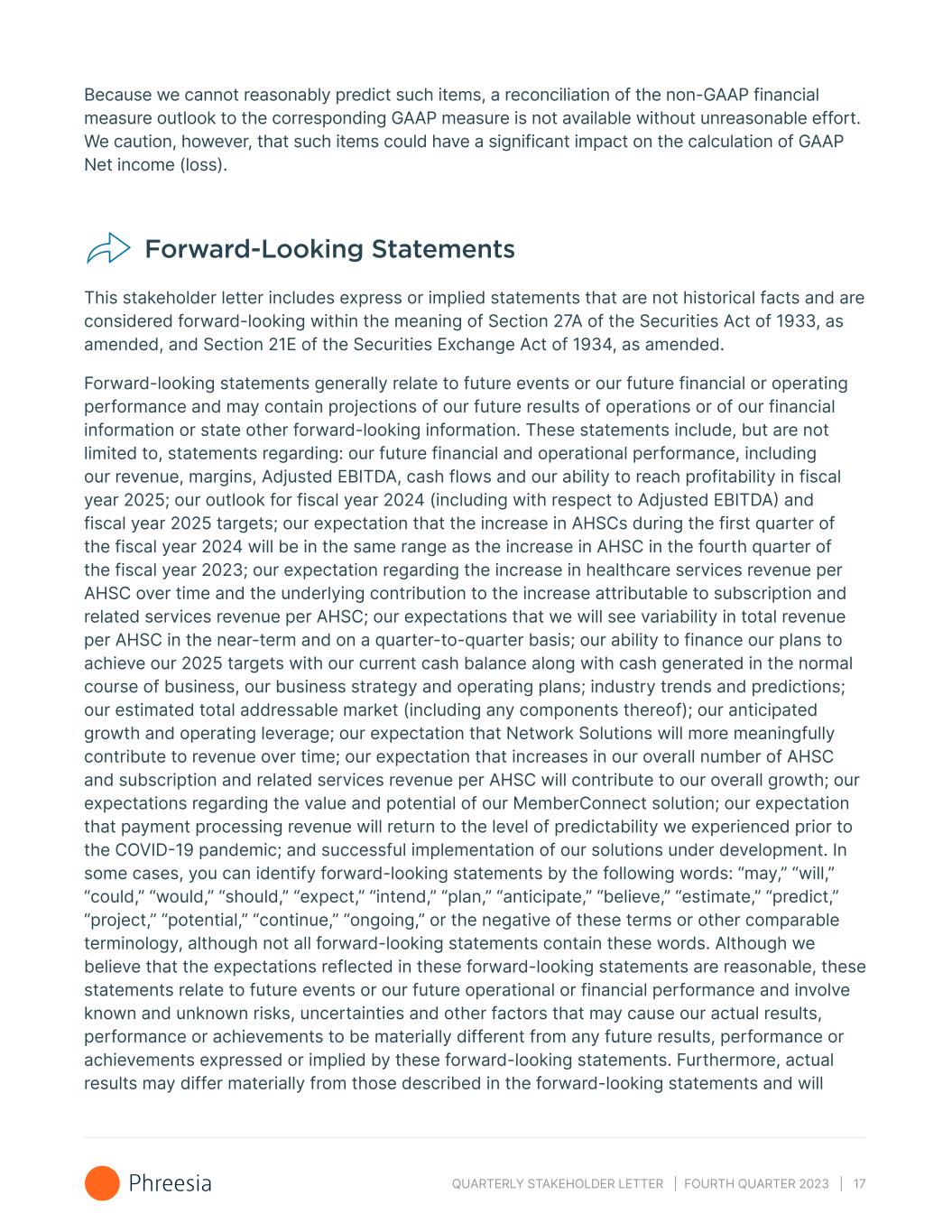 QUARTERLY STAKEHOLDER LETTER | FOURTH QUARTER 2023 | 17 Because we cannot reasonably predict such items, a reconciliation of the non-GAAP financial measure outlook to the corresponding GAAP measure is not available without unreasonable effort. We caution, however, that such items could have a significant impact on the calculation of GAAP Net income (loss). Forward-Looking Statements This stakeholder letter includes express or implied statements that are not historical facts and are considered forward-looking within the meaning of Section 27A of the Securities Act of 1933, as amended, and Section 21E of the Securities Exchange Act of 1934, as amended. Forward-looking statements generally relate to future events or our future financial or operating performance and may contain projections of our future results of operations or of our financial information or state other forward-looking information. These statements include, but are not limited to, statements regarding: our future financial and operational performance, including our revenue, margins, Adjusted EBITDA, cash flows and our ability to reach profitability in fiscal year 2025; our outlook for fiscal year 2024 (including with respect to Adjusted EBITDA) and fiscal year 2025 targets; our expectation that the increase in AHSCs during the first quarter of the fiscal year 2024 will be in the same range as the increase in AHSC in the fourth quarter of the fiscal year 2023; our expectation regarding the increase in healthcare services revenue per AHSC over time and the underlying contribution to the increase attributable to subscription and related services revenue per AHSC; our expectations that we will see variability in total revenue per AHSC in the near-term and on a quarter-to-quarter basis; our ability to finance our plans to achieve our 2025 targets with our current cash balance along with cash generated in the normal course of business, our business strategy and operating plans; industry trends and predictions; our estimated total addressable market (including any components thereof); our anticipated growth and operating leverage; our expectation that Network Solutions will more meaningfully contribute to revenue over time; our expectation that increases in our overall number of AHSC and subscription and related services revenue per AHSC will contribute to our overall growth; our expectations regarding the value and potential of our MemberConnect solution; our expectation that payment processing revenue will return to the level of predictability we experienced prior to the COVID-19 pandemic; and successful implementation of our solutions under development. In some cases, you can identify forward-looking statements by the following words: “may,” “will,” “could,” “would,” “should,” “expect,” “intend,” “plan,” “anticipate,” “believe,” “estimate,” “predict,” “project,” “potential,” “continue,” “ongoing,” or the negative of these terms or other comparable terminology, although not all forward-looking statements contain these words. Although we believe that the expectations reflected in these forward-looking statements are reasonable, these statements relate to future events or our future operational or financial performance and involve known and unknown risks, uncertainties and other factors that may cause our actual results, performance or achievements to be materially different from any future results, performance or achievements expressed or implied by these forward-looking statements. Furthermore, actual results may differ materially from those described in the forward-looking statements and will