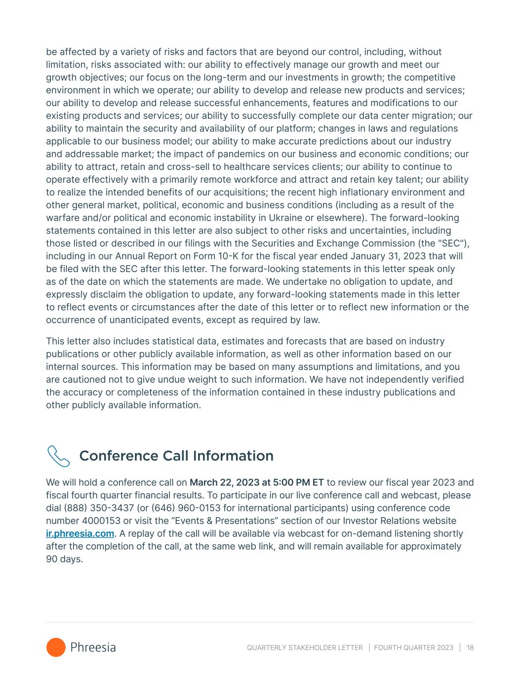 QUARTERLY STAKEHOLDER LETTER | FOURTH QUARTER 2023 | 18 be affected by a variety of risks and factors that are beyond our control, including, without limitation, risks associated with: our ability to effectively manage our growth and meet our growth objectives; our focus on the long-term and our investments in growth; the competitive environment in which we operate; our ability to develop and release new products and services; our ability to develop and release successful enhancements, features and modifications to our existing products and services; our ability to successfully complete our data center migration; our ability to maintain the security and availability of our platform; changes in laws and regulations applicable to our business model; our ability to make accurate predictions about our industry and addressable market; the impact of pandemics on our business and economic conditions; our ability to attract, retain and cross-sell to healthcare services clients; our ability to continue to operate effectively with a primarily remote workforce and attract and retain key talent; our ability to realize the intended benefits of our acquisitions; the recent high inflationary environment and other general market, political, economic and business conditions (including as a result of the warfare and/or political and economic instability in Ukraine or elsewhere). The forward-looking statements contained in this letter are also subject to other risks and uncertainties, including those listed or described in our filings with the Securities and Exchange Commission (the "SEC"), including in our Annual Report on Form 10-K for the fiscal year ended January 31, 2023 that will be filed with the SEC after this letter. The forward-looking statements in this letter speak only as of the date on which the statements are made. We undertake no obligation to update, and expressly disclaim the obligation to update, any forward-looking statements made in this letter to reflect events or circumstances after the date of this letter or to reflect new information or the occurrence of unanticipated events, except as required by law. This letter also includes statistical data, estimates and forecasts that are based on industry publications or other publicly available information, as well as other information based on our internal sources. This information may be based on many assumptions and limitations, and you are cautioned not to give undue weight to such information. We have not independently verified the accuracy or completeness of the information contained in these industry publications and other publicly available information. Conference Call Information We will hold a conference call on March 22, 2023 at 5:00 PM ET to review our fiscal year 2023 and fiscal fourth quarter financial results. To participate in our live conference call and webcast, please dial (888) 350-3437 (or (646) 960-0153 for international participants) using conference code number 4000153 or visit the “Events & Presentations” section of our Investor Relations website ir.phreesia.com. A replay of the call will be available via webcast for on-demand listening shortly after the completion of the call, at the same web link, and will remain available for approximately 90 days.