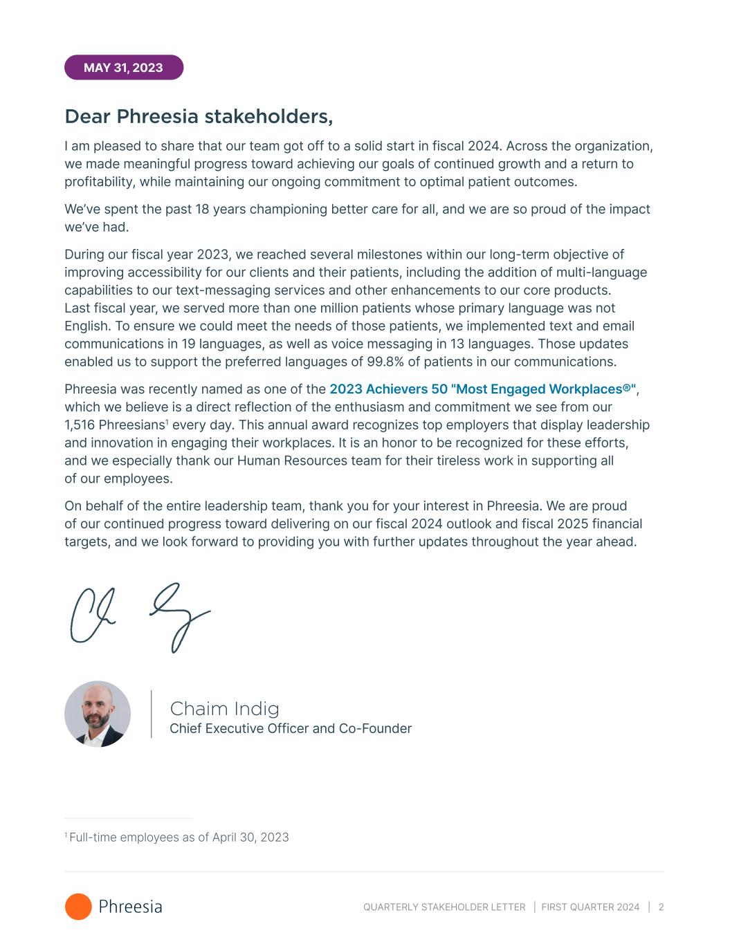 QUARTERLY STAKEHOLDER LETTER | FIRST QUARTER 2024 | 2 Dear Phreesia stakeholders, I am pleased to share that our team got off to a solid start in fiscal 2024. Across the organization, we made meaningful progress toward achieving our goals of continued growth and a return to profitability, while maintaining our ongoing commitment to optimal patient outcomes. We’ve spent the past 18 years championing better care for all, and we are so proud of the impact we’ve had. During our fiscal year 2023, we reached several milestones within our long-term objective of improving accessibility for our clients and their patients, including the addition of multi-language capabilities to our text-messaging services and other enhancements to our core products. Last fiscal year, we served more than one million patients whose primary language was not English. To ensure we could meet the needs of those patients, we implemented text and email communications in 19 languages, as well as voice messaging in 13 languages. Those updates enabled us to support the preferred languages of 99.8% of patients in our communications. Phreesia was recently named as one of the 2023 Achievers 50 "Most Engaged Workplaces®", which we believe is a direct reflection of the enthusiasm and commitment we see from our 1,516 Phreesians1 every day. This annual award recognizes top employers that display leadership and innovation in engaging their workplaces. It is an honor to be recognized for these efforts, and we especially thank our Human Resources team for their tireless work in supporting all of our employees. On behalf of the entire leadership team, thank you for your interest in Phreesia. We are proud of our continued progress toward delivering on our fiscal 2024 outlook and fiscal 2025 financial targets, and we look forward to providing you with further updates throughout the year ahead. MAY 31, 2023 Chaim Indig Chief Executive Officer and Co-Founder 1 Full-time employees as of April 30, 2023