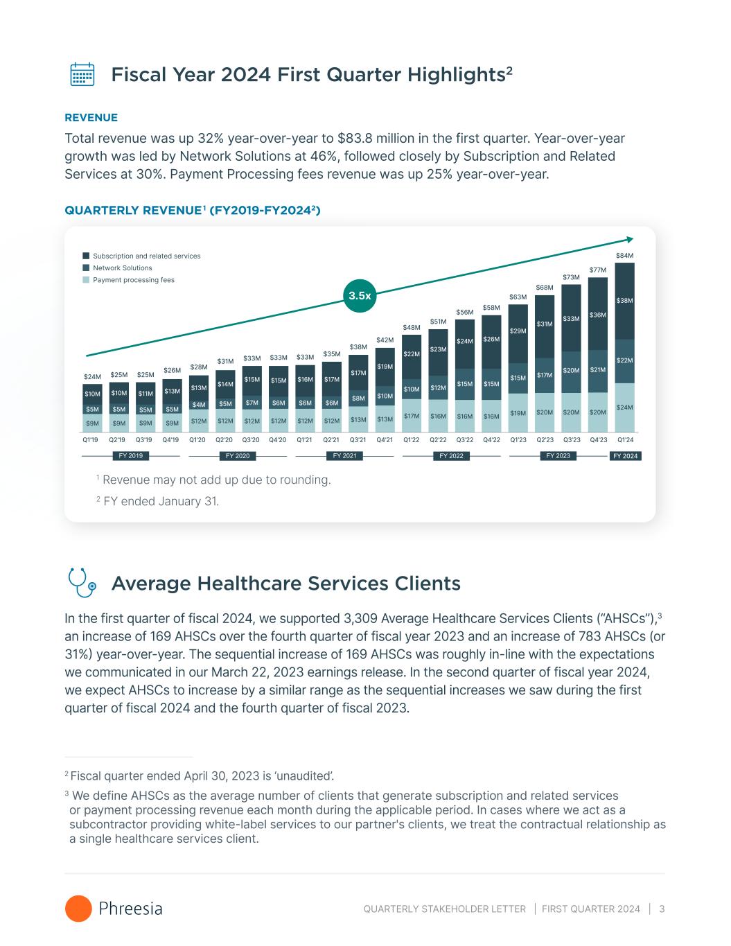 QUARTERLY STAKEHOLDER LETTER | FIRST QUARTER 2024 | 3 Fiscal Year 2024 First Quarter Highlights2 REVENUE Total revenue was up 32% year-over-year to $83.8 million in the first quarter. Year-over-year growth was led by Network Solutions at 46%, followed closely by Subscription and Related Services at 30%. Payment Processing fees revenue was up 25% year-over-year. QUARTERLY REVENUE1 (FY2019-FY20242) Q1’19 Q2’19 Q3’19 Q4’19 Q1’20 Q2’20 Q3’20 Q4’20 Q1’21 Q2’21 Q3’21 Q4’21 Q1’22 Q2’22 Q3’22 Q4’22 Q1’23 Q2’23 Q3’23 Q4’23 Subscription and related services Payment processing fees Network Solutions $10M $10M $11M $13M $13M $14M $15M $15M $16M $17M $17M $19M $22M $23M $24M $26M $29M $31M $33M $9M $9M $9M $9M $12M $12M $12M $12M $12M $12M $13M $13M $16M$17M $16M $16M $19M $20M $20M $5M $5M $5M $5M $4M $5M $7M $6M $6M $6M $8M $12M $10M $10M $15M $15M $15M $17M $20M $24M $25M $25M $26M $28M $31M $33M $33M $33M $35M $38M $42M $48M $51M $56M $58M $63M $68M $73M $36M $21M $20M $77M Q1’24 $38M $22M $24M $84M 3.5x 1 Revenue may not add up due to rounding. 2 FY ended January 31. Average Healthcare Services Clients In the first quarter of fiscal 2024, we supported 3,309 Average Healthcare Services Clients (“AHSCs”),3 an increase of 169 AHSCs over the fourth quarter of fiscal year 2023 and an increase of 783 AHSCs (or 31%) year-over-year. The sequential increase of 169 AHSCs was roughly in-line with the expectations we communicated in our March 22, 2023 earnings release. In the second quarter of fiscal year 2024, we expect AHSCs to increase by a similar range as the sequential increases we saw during the first quarter of fiscal 2024 and the fourth quarter of fiscal 2023. 2 Fiscal quarter ended April 30, 2023 is ‘unaudited’. 3 We define AHSCs as the average number of clients that generate subscription and related services or payment processing revenue each month during the applicable period. In cases where we act as a subcontractor providing white-label services to our partner's clients, we treat the contractual relationship as a single healthcare services client.