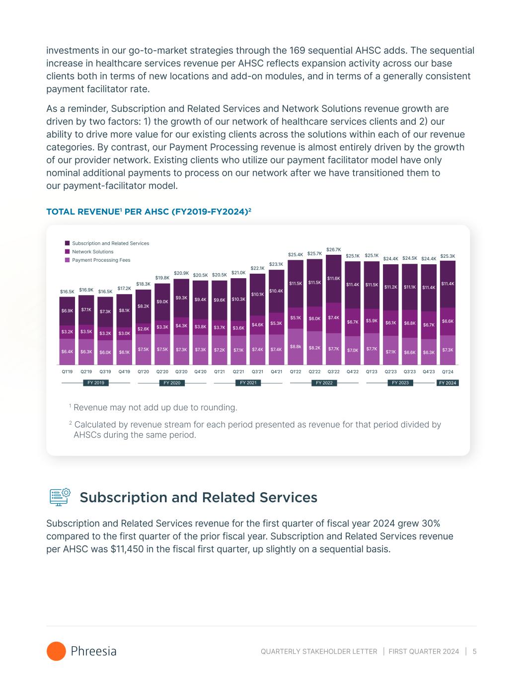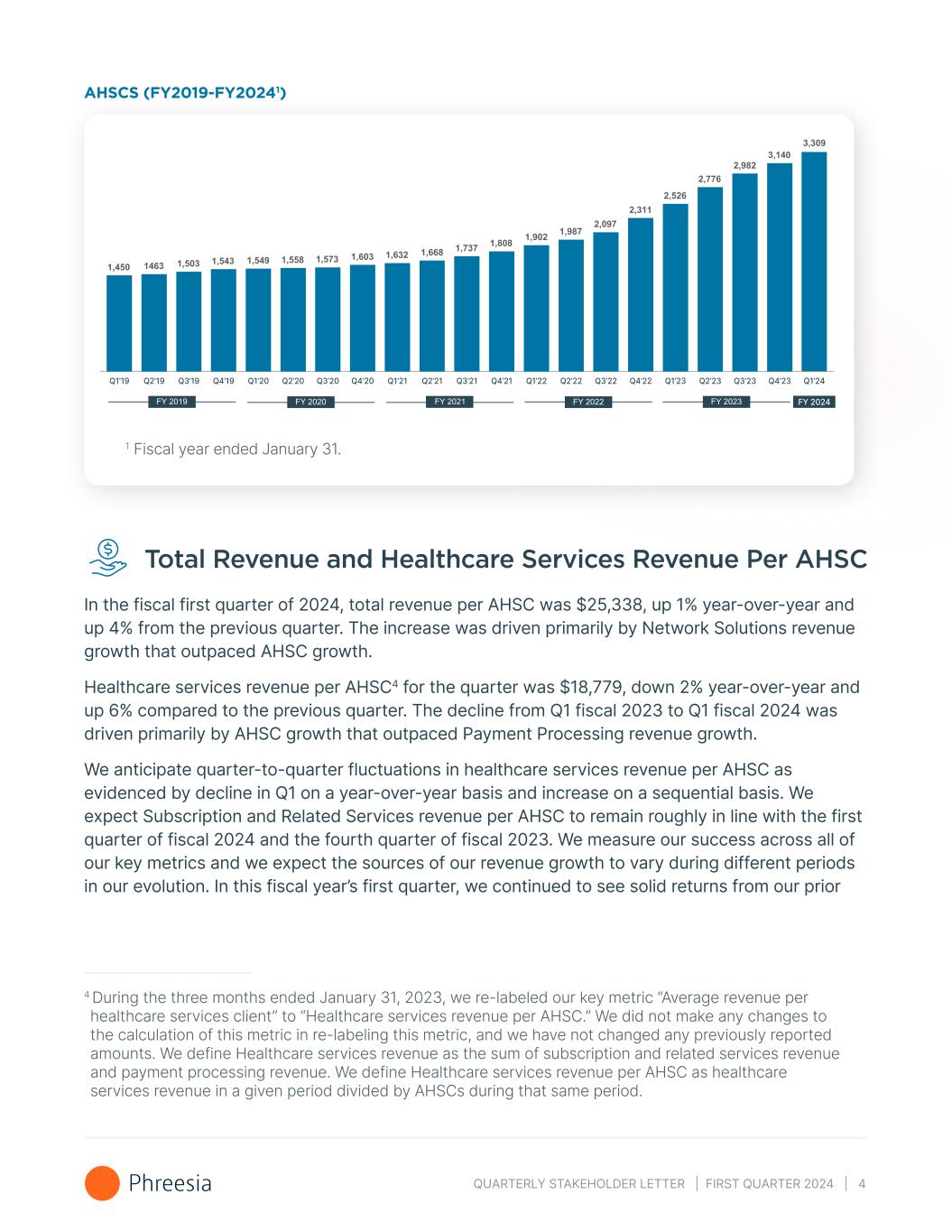 QUARTERLY STAKEHOLDER LETTER | FIRST QUARTER 2024 | 4 AHSCS (FY2019-FY20241) Q1’19 Q2’19 Q3’19 Q4’19 Q1’20 Q2’20 Q3’20 Q4’20 Q1’21 Q2’21 Q3’21 Q4’21 Q1’22 Q2’22 Q3’22 Q4’22 Q1’23 Q2’23 Q3’23 Q4’23 Q1’24 1 Fiscal year ended January 31. Total Revenue and Healthcare Services Revenue Per AHSC In the fiscal first quarter of 2024, total revenue per AHSC was $25,338, up 1% year-over-year and up 4% from the previous quarter. The increase was driven primarily by Network Solutions revenue growth that outpaced AHSC growth. Healthcare services revenue per AHSC4 for the quarter was $18,779, down 2% year-over-year and up 6% compared to the previous quarter. The decline from Q1 fiscal 2023 to Q1 fiscal 2024 was driven primarily by AHSC growth that outpaced Payment Processing revenue growth. We anticipate quarter-to-quarter fluctuations in healthcare services revenue per AHSC as evidenced by decline in Q1 on a year-over-year basis and increase on a sequential basis. We expect Subscription and Related Services revenue per AHSC to remain roughly in line with the first quarter of fiscal 2024 and the fourth quarter of fiscal 2023. We measure our success across all of our key metrics and we expect the sources of our revenue growth to vary during different periods in our evolution. In this fiscal year’s first quarter, we continued to see solid returns from our prior 4 During the three months ended January 31, 2023, we re-labeled our key metric “Average revenue per healthcare services client” to “Healthcare services revenue per AHSC.” We did not make any changes to the calculation of this metric in re-labeling this metric, and we have not changed any previously reported amounts. We define Healthcare services revenue as the sum of subscription and related services revenue and payment processing revenue. We define Healthcare services revenue per AHSC as healthcare services revenue in a given period divided by AHSCs during that same period.