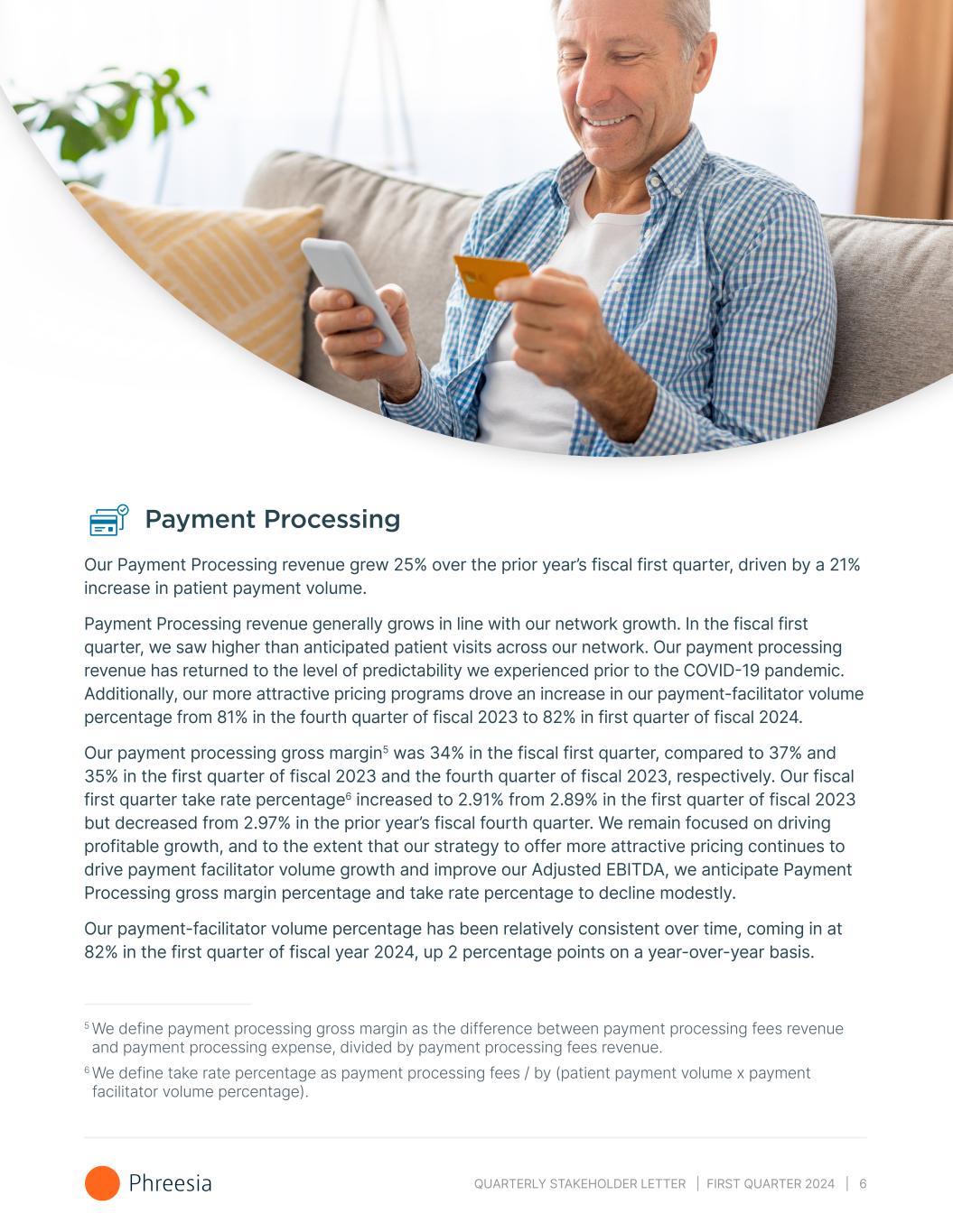 QUARTERLY STAKEHOLDER LETTER | FIRST QUARTER 2024 | 6 Payment Processing Our Payment Processing revenue grew 25% over the prior year’s fiscal first quarter, driven by a 21% increase in patient payment volume. Payment Processing revenue generally grows in line with our network growth. In the fiscal first quarter, we saw higher than anticipated patient visits across our network. Our payment processing revenue has returned to the level of predictability we experienced prior to the COVID-19 pandemic. Additionally, our more attractive pricing programs drove an increase in our payment-facilitator volume percentage from 81% in the fourth quarter of fiscal 2023 to 82% in first quarter of fiscal 2024. Our payment processing gross margin5 was 34% in the fiscal first quarter, compared to 37% and 35% in the first quarter of fiscal 2023 and the fourth quarter of fiscal 2023, respectively. Our fiscal first quarter take rate percentage6 increased to 2.91% from 2.89% in the first quarter of fiscal 2023 but decreased from 2.97% in the prior year’s fiscal fourth quarter. We remain focused on driving profitable growth, and to the extent that our strategy to offer more attractive pricing continues to drive payment facilitator volume growth and improve our Adjusted EBITDA, we anticipate Payment Processing gross margin percentage and take rate percentage to decline modestly. Our payment-facilitator volume percentage has been relatively consistent over time, coming in at 82% in the first quarter of fiscal year 2024, up 2 percentage points on a year-over-year basis. 5 We define payment processing gross margin as the difference between payment processing fees revenue and payment processing expense, divided by payment processing fees revenue. 6 We define take rate percentage as payment processing fees / by (patient payment volume x payment facilitator volume percentage).