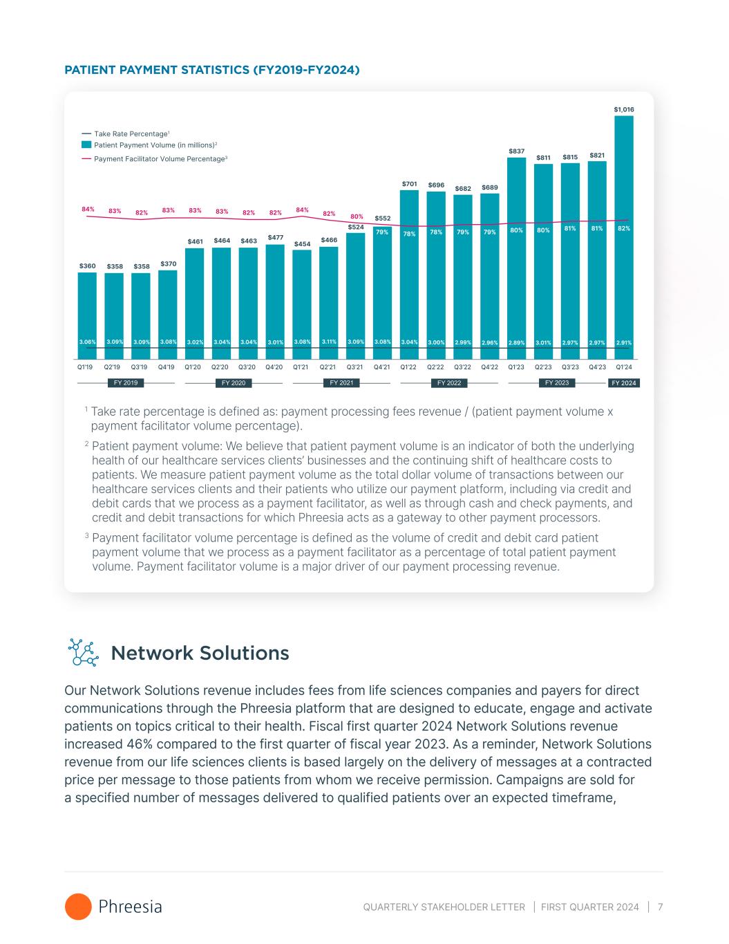 QUARTERLY STAKEHOLDER LETTER | FIRST QUARTER 2024 | 7 PATIENT PAYMENT STATISTICS (FY2019-FY2024) Q1’19 Q2’19 Q3’19 Q4’19 Q1’20 Q2’20 Q3’20 Q4’20 Q1’21 Q2’21 Q3’21 Q4’21 Q1’22 Q2’22 Q3’22 Q4’22 Q1’23 Q2’23 Q3’23 Q4’23 Payment Facilitator Volume Percentage3 Take Rate Percentage1 Patient Payment Volume (in millions)2 $360 $358 $358 $370 $461 $464 $463 $477 $454 $466 $524 $552 $701 $696 $682 $689 $837 $811 $815 3.06% 3.09% 3.09% 3.08% 3.02% 3.04% 3.04% 3.01% 3.08% 3.11% 3.09% 3.08% 3.04% 3.00% 2.99% 2.96% 2.89% 3.01% 2.97% $821 $1,016 2.97% 2.91% 81% 81% 82% 80%82%84%82%82%83%83%83%82%83%84% 80%80%79%79%78%78%79% Q1’24 1 Take rate percentage is defined as: payment processing fees revenue / (patient payment volume x payment facilitator volume percentage). 2 Patient payment volume: We believe that patient payment volume is an indicator of both the underlying health of our healthcare services clients’ businesses and the continuing shift of healthcare costs to patients. We measure patient payment volume as the total dollar volume of transactions between our healthcare services clients and their patients who utilize our payment platform, including via credit and debit cards that we process as a payment facilitator, as well as through cash and check payments, and credit and debit transactions for which Phreesia acts as a gateway to other payment processors. 3 Payment facilitator volume percentage is defined as the volume of credit and debit card patient payment volume that we process as a payment facilitator as a percentage of total patient payment volume. Payment facilitator volume is a major driver of our payment processing revenue. Network Solutions Our Network Solutions revenue includes fees from life sciences companies and payers for direct communications through the Phreesia platform that are designed to educate, engage and activate patients on topics critical to their health. Fiscal first quarter 2024 Network Solutions revenue increased 46% compared to the first quarter of fiscal year 2023. As a reminder, Network Solutions revenue from our life sciences clients is based largely on the delivery of messages at a contracted price per message to those patients from whom we receive permission. Campaigns are sold for a specified number of messages delivered to qualified patients over an expected timeframe,