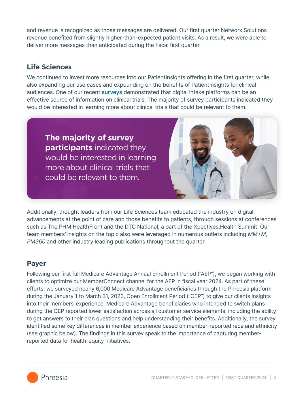 QUARTERLY STAKEHOLDER LETTER | FIRST QUARTER 2024 | 8 and revenue is recognized as those messages are delivered. Our first quarter Network Solutions revenue benefited from slightly higher-than-expected patient visits. As a result, we were able to deliver more messages than anticipated during the fiscal first quarter. Life Sciences We continued to invest more resources into our PatientInsights offering in the first quarter, while also expanding our use cases and expounding on the benefits of PatientInsights for clinical audiences. One of our recent surveys demonstrated that digital intake platforms can be an effective source of information on clinical trials. The majority of survey participants indicated they would be interested in learning more about clinical trials that could be relevant to them. The majority of survey participants indicated they would be interested in learning more about clinical trials that could be relevant to them. Additionally, thought leaders from our Life Sciences team educated the industry on digital advancements at the point of care and those benefits to patients, through sessions at conferences such as The PHM HealthFront and the DTC National, a part of the Xpectives.Health Summit. Our team members’ insights on the topic also were leveraged in numerous outlets including MM+M, PM360 and other industry leading publications throughout the quarter. Payer Following our first full Medicare Advantage Annual Enrollment Period (“AEP”), we began working with clients to optimize our MemberConnect channel for the AEP in fiscal year 2024. As part of these efforts, we surveyed nearly 6,000 Medicare Advantage beneficiaries through the Phreesia platform during the January 1 to March 31, 2023, Open Enrollment Period (“OEP”) to give our clients insights into their members’ experience. Medicare Advantage beneficiaries who intended to switch plans during the OEP reported lower satisfaction across all customer service elements, including the ability to get answers to their plan questions and help understanding their benefits. Additionally, the survey identified some key differences in member experience based on member-reported race and ethnicity (see graphic below). The findings in this survey speak to the importance of capturing member- reported data for health-equity initiatives.