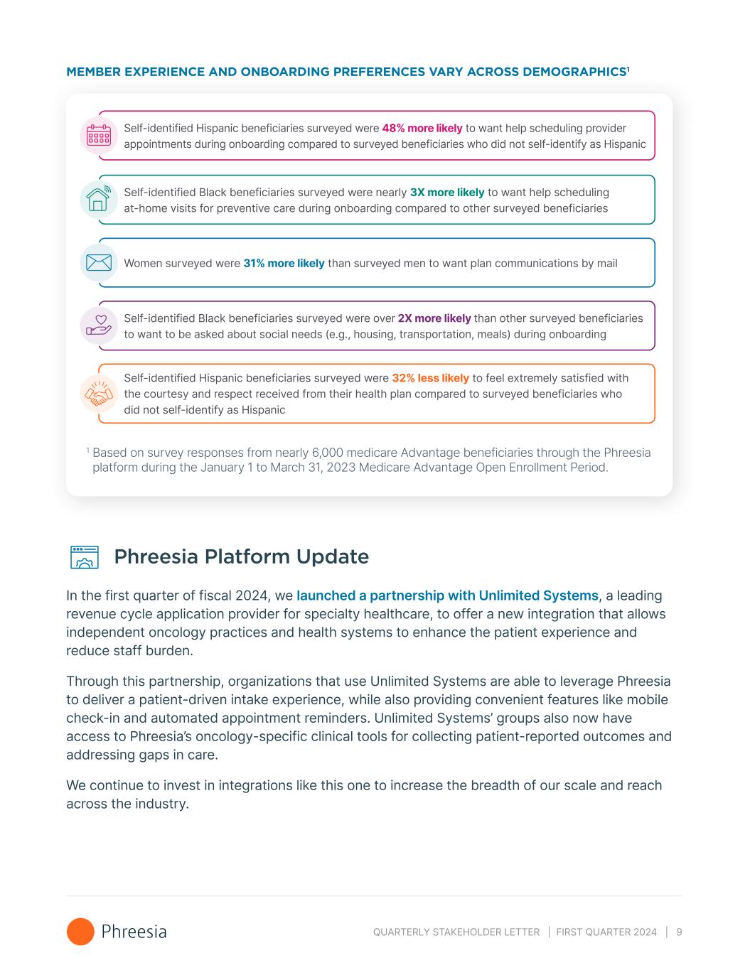 QUARTERLY STAKEHOLDER LETTER | FIRST QUARTER 2024 | 9 MEMBER EXPERIENCE AND ONBOARDING PREFERENCES VARY ACROSS DEMOGRAPHICS1 Self-identified Hispanic beneficiaries surveyed were 48% more likely to want help scheduling provider appointments during onboarding compared to surveyed beneficiaries who did not self-identify as Hispanic Self-identified Black beneficiaries surveyed were nearly 3X more likely to want help scheduling at- home visits for preventive care during onboarding compared to other surveyed beneficiaries Women surveyed were 31% more likely than surveyed men to want plan communications by mail Self-identified Black beneficiaries surveyed were over 2X more likely than other surveyed beneficiaries to want to be asked about social needs (e.g., housing, transportation, meals) during onboarding Self-identified Hispanic beneficiaries surveyed were 32% less likely to feel extremely satisfied with the courtesy and respect received from their health plan compared to surveyed beneficiaries who did not self-identify as Hispanic 1 Based on survey responses from nearly 6,000 medicare Advantage beneficiaries through the Phreesia platform during the January 1 to March 31, 2023 Medicare Advantage Open Enrollment Period. Phreesia Platform Update In the first quarter of fiscal 2024, we launched a partnership with Unlimited Systems, a leading revenue cycle application provider for specialty healthcare, to offer a new integration that allows independent oncology practices and health systems to enhance the patient experience and reduce staff burden. Through this partnership, organizations that use Unlimited Systems are able to leverage Phreesia to deliver a patient-driven intake experience, while also providing convenient features like mobile check-in and automated appointment reminders. Unlimited Systems’ groups also now have access to Phreesia’s oncology-specific clinical tools for collecting patient-reported outcomes and addressing gaps in care. We continue to invest in integrations like this one to increase the breadth of our scale and reach across the industry.