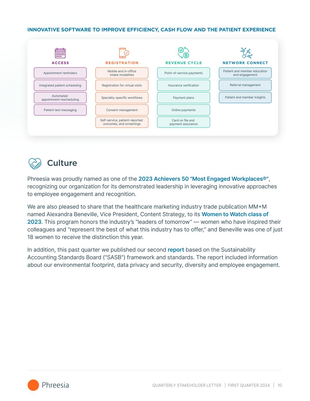 QUARTERLY STAKEHOLDER LETTER | FIRST QUARTER 2024 | 10 INNOVATIVE SOFTWARE TO IMPROVE EFFICIENCY, CASH FLOW AND THE PATIENT EXPERIENCE Mobile and in-office intake modalitiesAppointment reminders Point-of-service payments Insurance verification Card on file and payment assurance Payment plans Online payments Specialty-specific workflows Registration for virtual visits Consent management Self-service, patient-reported outcomes, and screenings Patient and member education and engagement Referral management Patient and member insights Integrated patient scheduling Automated appointment rescheduling ACCESS REGISTRATION REVENUE CYCLE NETWORK CONNECT Patient text messaging Culture Phreesia was proudly named as one of the 2023 Achievers 50 "Most Engaged Workplaces®", recognizing our organization for its demonstrated leadership in leveraging innovative approaches to employee engagement and recognition. We are also pleased to share that the healthcare marketing industry trade publication MM+M named Alexandra Beneville, Vice President, Content Strategy, to its Women to Watch class of 2023. This program honors the industry’s “leaders of tomorrow” — women who have inspired their colleagues and “represent the best of what this industry has to offer,” and Beneville was one of just 18 women to receive the distinction this year. In addition, this past quarter we published our second report based on the Sustainability Accounting Standards Board ("SASB") framework and standards. The report included information about our environmental footprint, data privacy and security, diversity and employee engagement.