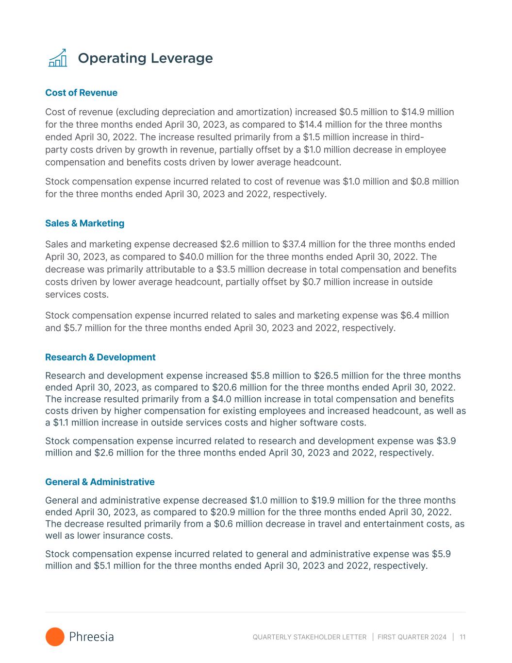 QUARTERLY STAKEHOLDER LETTER | FIRST QUARTER 2024 | 11 Operating Leverage Cost of Revenue Cost of revenue (excluding depreciation and amortization) increased $0.5 million to $14.9 million for the three months ended April 30, 2023, as compared to $14.4 million for the three months ended April 30, 2022. The increase resulted primarily from a $1.5 million increase in third- party costs driven by growth in revenue, partially offset by a $1.0 million decrease in employee compensation and benefits costs driven by lower average headcount. Stock compensation expense incurred related to cost of revenue was $1.0 million and $0.8 million for the three months ended April 30, 2023 and 2022, respectively. Sales & Marketing Sales and marketing expense decreased $2.6 million to $37.4 million for the three months ended April 30, 2023, as compared to $40.0 million for the three months ended April 30, 2022. The decrease was primarily attributable to a $3.5 million decrease in total compensation and benefits costs driven by lower average headcount, partially offset by $0.7 million increase in outside services costs. Stock compensation expense incurred related to sales and marketing expense was $6.4 million and $5.7 million for the three months ended April 30, 2023 and 2022, respectively. Research & Development Research and development expense increased $5.8 million to $26.5 million for the three months ended April 30, 2023, as compared to $20.6 million for the three months ended April 30, 2022. The increase resulted primarily from a $4.0 million increase in total compensation and benefits costs driven by higher compensation for existing employees and increased headcount, as well as a $1.1 million increase in outside services costs and higher software costs. Stock compensation expense incurred related to research and development expense was $3.9 million and $2.6 million for the three months ended April 30, 2023 and 2022, respectively. General & Administrative General and administrative expense decreased $1.0 million to $19.9 million for the three months ended April 30, 2023, as compared to $20.9 million for the three months ended April 30, 2022. The decrease resulted primarily from a $0.6 million decrease in travel and entertainment costs, as well as lower insurance costs. Stock compensation expense incurred related to general and administrative expense was $5.9 million and $5.1 million for the three months ended April 30, 2023 and 2022, respectively.