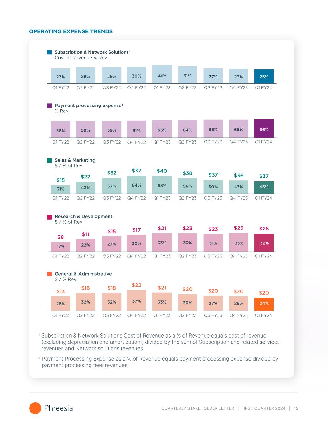 QUARTERLY STAKEHOLDER LETTER | FIRST QUARTER 2024 | 12 OPERATING EXPENSE TRENDS 27% 29% 29% 30% 33% 31% 27% Subscription & Network Solutions1 Cost of Revenue % Rev Q1 FY22 Q2 FY22 Q3 FY22 Q4 FY22 Q1 FY23 Q2 FY23 Q3 FY23 Q4 FY23 Q4 FY23 Q4 FY23 Q4 FY23 Q4 FY23 58% 59% 59% 61% 63% 64% 65% Payment processing expense2 % Rev Q1 FY22 Q2 FY22 Q3 FY22 Q4 FY22 Q1 FY23 Q2 FY23 Q3 FY23 Sales & Marketing $ / % of Rev Q1 FY22 Q2 FY22 Q3 FY22 Q4 FY22 Q1 FY23 Q2 FY23 Q3 FY23 31% 43% 57% 64% 63% 56% 50% $15 $22 $32 $37 $40 $38 $37 17% 22% 27% 30% 33% 33% 31% Research & Development $ / % of Rev Q1 FY22 Q2 FY22 Q3 FY22 Q4 FY22 Q1 FY23 Q2 FY23 Q3 FY23 $8 $11 $15 $17 $21 $23 $23 26% 32% 32% 37% 33% 30% 27% General & Administrative $ / % Rev Q1 FY22 Q2 FY22 Q3 FY22 Q4 FY22 Q1 FY23 Q2 FY23 Q3 FY23 $13 $16 $18 $22 $21 $20 $20 27% 65% 47% $36 33% $25 26% $20 Q1 FY24 Q1 FY24 Q1 FY24 Q1 FY24 Q1 FY24 25% 66% 45% $37 32% $26 24% $20 1 Subscription & Network Solutions Cost of Revenue as a % of Revenue equals cost of revenue (excluding depreciation and amortization), divided by the sum of Subscription and related services revenues and Network solutions revenues. 2 Payment Processing Expense as a % of Revenue equals payment processing expense divided by payment processing fees revenues.
