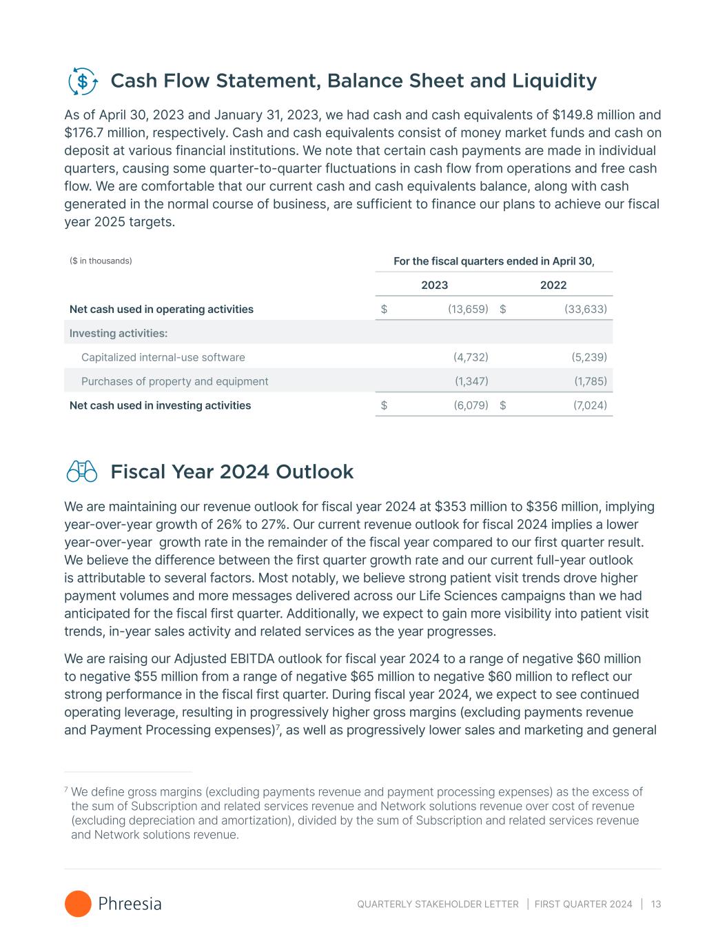 QUARTERLY STAKEHOLDER LETTER | FIRST QUARTER 2024 | 13 Cash Flow Statement, Balance Sheet and Liquidity As of April 30, 2023 and January 31, 2023, we had cash and cash equivalents of $149.8 million and $176.7 million, respectively. Cash and cash equivalents consist of money market funds and cash on deposit at various financial institutions. We note that certain cash payments are made in individual quarters, causing some quarter-to-quarter fluctuations in cash flow from operations and free cash flow. We are comfortable that our current cash and cash equivalents balance, along with cash generated in the normal course of business, are sufficient to finance our plans to achieve our fiscal year 2025 targets. ($ in thousands) For the fiscal quarters ended in April 30, 2023 2022 Net cash used in operating activities $ (13,659) $ (33,633) Investing activities: Capitalized internal-use software (4,732) (5,239) Purchases of property and equipment (1,347) (1,785) Net cash used in investing activities $ (6,079) $ (7,024) Fiscal Year 2024 Outlook We are maintaining our revenue outlook for fiscal year 2024 at $353 million to $356 million, implying year-over-year growth of 26% to 27%. Our current revenue outlook for fiscal 2024 implies a lower year-over-year growth rate in the remainder of the fiscal year compared to our first quarter result. We believe the difference between the first quarter growth rate and our current full-year outlook is attributable to several factors. Most notably, we believe strong patient visit trends drove higher payment volumes and more messages delivered across our Life Sciences campaigns than we had anticipated for the fiscal first quarter. Additionally, we expect to gain more visibility into patient visit trends, in-year sales activity and related services as the year progresses. We are raising our Adjusted EBITDA outlook for fiscal year 2024 to a range of negative $60 million to negative $55 million from a range of negative $65 million to negative $60 million to reflect our strong performance in the fiscal first quarter. During fiscal year 2024, we expect to see continued operating leverage, resulting in progressively higher gross margins (excluding payments revenue and Payment Processing expenses)7, as well as progressively lower sales and marketing and general 7 We define gross margins (excluding payments revenue and payment processing expenses) as the excess of the sum of Subscription and related services revenue and Network solutions revenue over cost of revenue (excluding depreciation and amortization), divided by the sum of Subscription and related services revenue and Network solutions revenue.