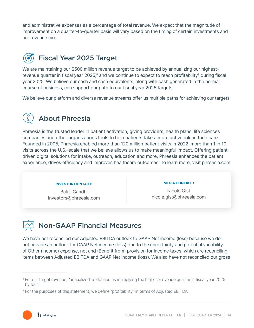 QUARTERLY STAKEHOLDER LETTER | FIRST QUARTER 2024 | 14 and administrative expenses as a percentage of total revenue. We expect that the magnitude of improvement on a quarter-to-quarter basis will vary based on the timing of certain investments and our revenue mix. Fiscal Year 2025 Target We are maintaining our $500 million revenue target to be achieved by annualizing our highest- revenue quarter in fiscal year 2025,8 and we continue to expect to reach profitability9 during fiscal year 2025. We believe our cash and cash equivalents, along with cash generated in the normal course of business, can support our path to our fiscal year 2025 targets. We believe our platform and diverse revenue streams offer us multiple paths for achieving our targets. About Phreesia Phreesia is the trusted leader in patient activation, giving providers, health plans, life sciences companies and other organizations tools to help patients take a more active role in their care. Founded in 2005, Phreesia enabled more than 120 million patient visits in 2022–more than 1 in 10 visits across the U.S.–scale that we believe allows us to make meaningful impact. Offering patient- driven digital solutions for intake, outreach, education and more, Phreesia enhances the patient experience, drives efficiency and improves healthcare outcomes. To learn more, visit phreesia.com. INVESTOR CONTACT: Balaji Gandhi investors@phreesia.com MEDIA CONTACT: Nicole Gist nicole.gist@phreesia.com Non-GAAP Financial Measures We have not reconciled our Adjusted EBITDA outlook to GAAP Net income (loss) because we do not provide an outlook for GAAP Net income (loss) due to the uncertainty and potential variability of Other (income) expense, net and (Benefit from) provision for income taxes, which are reconciling items between Adjusted EBITDA and GAAP Net income (loss). We also have not reconciled our gross 8 For our target revenue, “annualized” is defined as multiplying the highest-revenue quarter in fiscal year 2025 by four. 9 For the purposes of this statement, we define “profitability” in terms of Adjusted EBITDA.