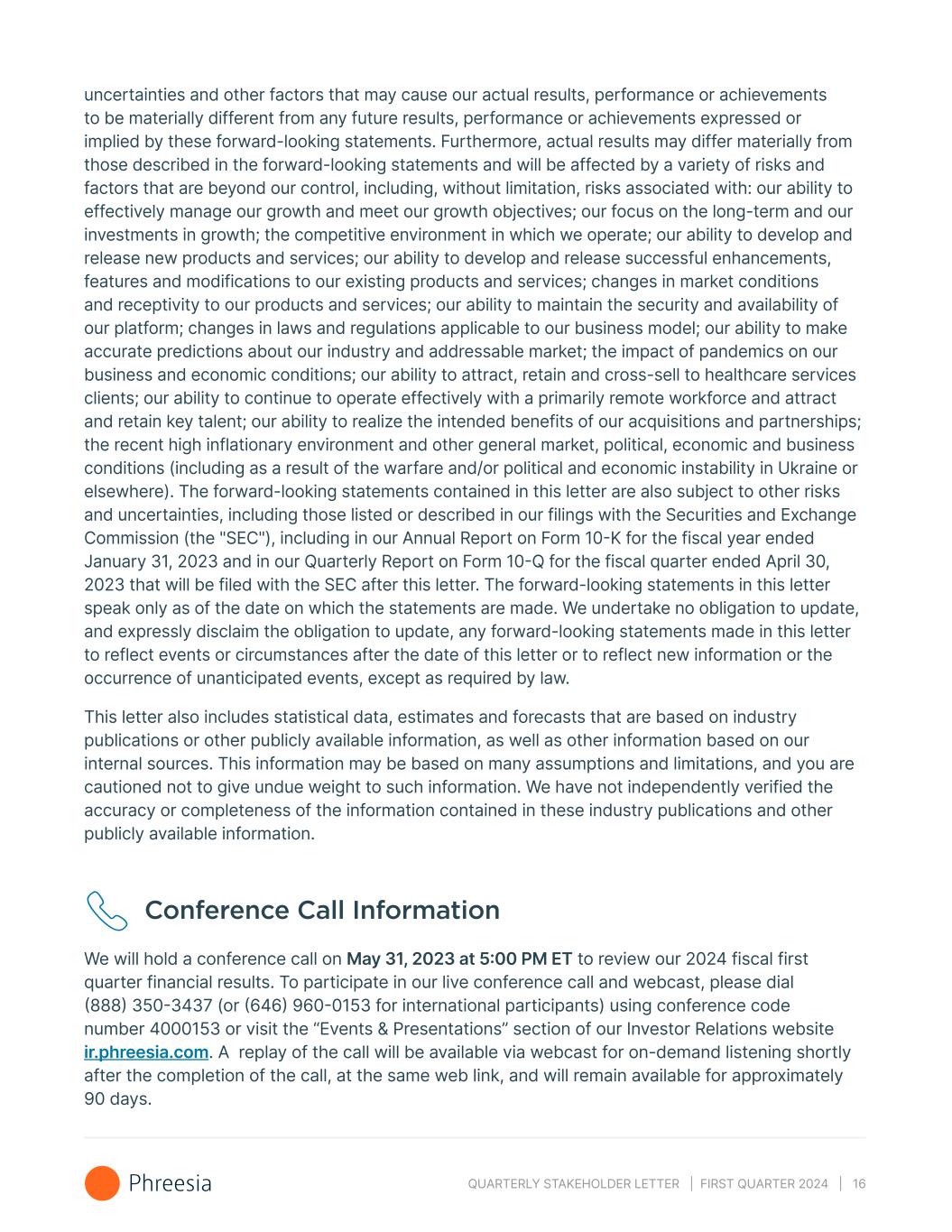 QUARTERLY STAKEHOLDER LETTER | FIRST QUARTER 2024 | 16 uncertainties and other factors that may cause our actual results, performance or achievements to be materially different from any future results, performance or achievements expressed or implied by these forward-looking statements. Furthermore, actual results may differ materially from those described in the forward-looking statements and will be affected by a variety of risks and factors that are beyond our control, including, without limitation, risks associated with: our ability to effectively manage our growth and meet our growth objectives; our focus on the long-term and our investments in growth; the competitive environment in which we operate; our ability to develop and release new products and services; our ability to develop and release successful enhancements, features and modifications to our existing products and services; changes in market conditions and receptivity to our products and services; our ability to maintain the security and availability of our platform; changes in laws and regulations applicable to our business model; our ability to make accurate predictions about our industry and addressable market; the impact of pandemics on our business and economic conditions; our ability to attract, retain and cross-sell to healthcare services clients; our ability to continue to operate effectively with a primarily remote workforce and attract and retain key talent; our ability to realize the intended benefits of our acquisitions and partnerships; the recent high inflationary environment and other general market, political, economic and business conditions (including as a result of the warfare and/or political and economic instability in Ukraine or elsewhere). The forward-looking statements contained in this letter are also subject to other risks and uncertainties, including those listed or described in our filings with the Securities and Exchange Commission (the "SEC"), including in our Annual Report on Form 10-K for the fiscal year ended January 31, 2023 and in our Quarterly Report on Form 10-Q for the fiscal quarter ended April 30, 2023 that will be filed with the SEC after this letter. The forward-looking statements in this letter speak only as of the date on which the statements are made. We undertake no obligation to update, and expressly disclaim the obligation to update, any forward-looking statements made in this letter to reflect events or circumstances after the date of this letter or to reflect new information or the occurrence of unanticipated events, except as required by law. This letter also includes statistical data, estimates and forecasts that are based on industry publications or other publicly available information, as well as other information based on our internal sources. This information may be based on many assumptions and limitations, and you are cautioned not to give undue weight to such information. We have not independently verified the accuracy or completeness of the information contained in these industry publications and other publicly available information. Conference Call Information We will hold a conference call on May 31, 2023 at 5:00 PM ET to review our 2024 fiscal first quarter financial results. To participate in our live conference call and webcast, please dial (888) 350-3437 (or (646) 960-0153 for international participants) using conference code number 4000153 or visit the “Events & Presentations” section of our Investor Relations website ir.phreesia.com. A replay of the call will be available via webcast for on-demand listening shortly after the completion of the call, at the same web link, and will remain available for approximately 90 days.