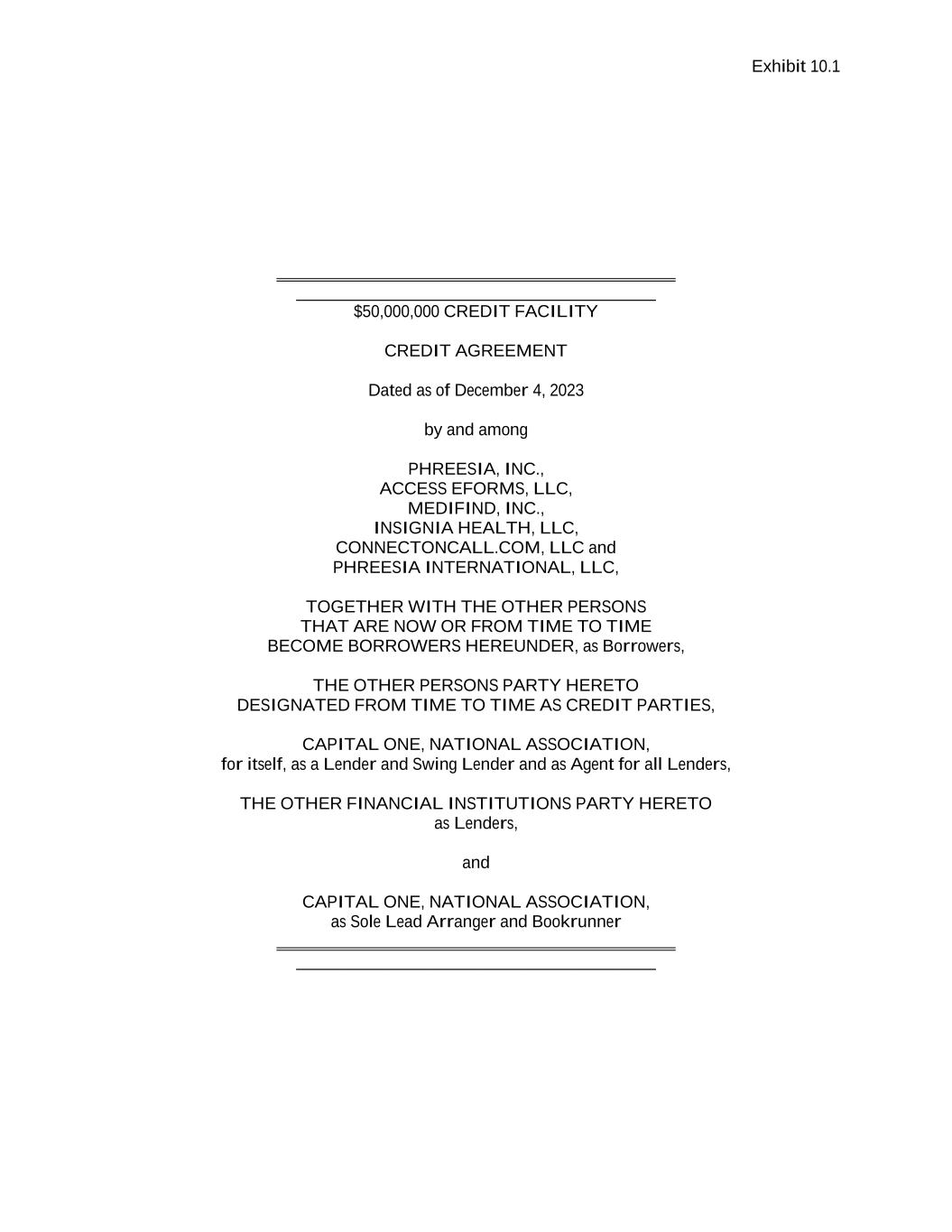 Exhibit 10.1 __________________________________________ $50,000,000 CREDIT FACILITY CREDIT AGREEMENT Dated as of December 4, 2023 by and among PHREESIA, INC., ACCESS EFORMS, LLC, MEDIFIND, INC., INSIGNIA HEALTH, LLC, CONNECTONCALL.COM, LLC and PHREESIA INTERNATIONAL, LLC, TOGETHER WITH THE OTHER PERSONS THAT ARE NOW OR FROM TIME TO TIME BECOME BORROWERS HEREUNDER, as Borrowers, THE OTHER PERSONS PARTY HERETO DESIGNATED FROM TIME TO TIME AS CREDIT PARTIES, CAPITAL ONE, NATIONAL ASSOCIATION, for itself, as a Lender and Swing Lender and as Agent for all Lenders, THE OTHER FINANCIAL INSTITUTIONS PARTY HERETO as Lenders, and CAPITAL ONE, NATIONAL ASSOCIATION, as Sole Lead Arranger and Bookrunner __________________________________________