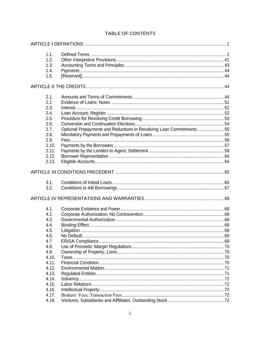 i TABLE OF CONTENTS ARTICLE I DEFINITIONS ......................................................................................................................... 1 1.1. Defined Terms .................................................................................................................... 1 1.2. Other Interpretive Provisions. ........................................................................................... 41 1.3. Accounting Terms and Principles. .................................................................................... 43 1.4. Payments ........................................................................................................................... 44 1.5. [Reserved] ......................................................................................................................... 44 ARTICLE II THE CREDITS ...................................................................................................................... 44 2.1. Amounts and Terms of Commitments. ............................................................................. 44 2.2. Evidence of Loans; Notes. ................................................................................................ 51 2.3. Interest. ............................................................................................................................. 52 2.4. Loan Account; Register .................................................................................................... 52 2.5. Procedure for Revolving Credit Borrowing ...................................................................... 53 2.6. Conversion and Continuation Elections ............................................................................ 54 2.7. Optional Prepayments and Reductions in Revolving Loan Commitments ....................... 55 2.8. Mandatory Payments and Prepayments of Loans ............................................................. 55 2.9. Fees ................................................................................................................................... 56 2.10. Payments by the Borrowers .............................................................................................. 57 2.11. Payments by the Lenders to Agent; Settlement ................................................................ 59 2.12. Borrower Representative .................................................................................................. 64 2.13. Eligible Accounts .............................................................................................................. 64 ARTICLE III CONDITIONS PRECEDENT ............................................................................................. 65 3.1. Conditions of Initial Loans ............................................................................................... 65 3.2. Conditions to All Borrowings ........................................................................................... 67 ARTICLE IV REPRESENTATIONS AND WARRANTIES .................................................................... 68 4.1. Corporate Existence and Power ........................................................................................ 68 4.2. Corporate Authorization; No Contravention..................................................................... 68 4.3. Governmental Authorization ............................................................................................ 68 4.4. Binding Effect ................................................................................................................... 68 4.5. Litigation ........................................................................................................................... 68 4.6. No Default......................................................................................................................... 69 4.7. ERISA Compliance ........................................................................................................... 69 4.8. Use of Proceeds; Margin Regulations ............................................................................... 70 4.9. Ownership of Property; Liens ........................................................................................... 70 4.10. Taxes ................................................................................................................................. 70 4.11. Financial Condition. .......................................................................................................... 70 4.12. Environmental Matters ..................................................................................................... 71 4.13. Regulated Entities ............................................................................................................. 71 4.14. Solvency............................................................................................................................ 72 4.15. Labor Relations ................................................................................................................. 72 4.16. Intellectual Property .......................................................................................................... 72 4.17. Brokers’ Fees; Transaction Fees ....................................................................................... 72 4.18. Ventures, Subsidiaries and Affiliates; Outstanding Stock ................................................ 72