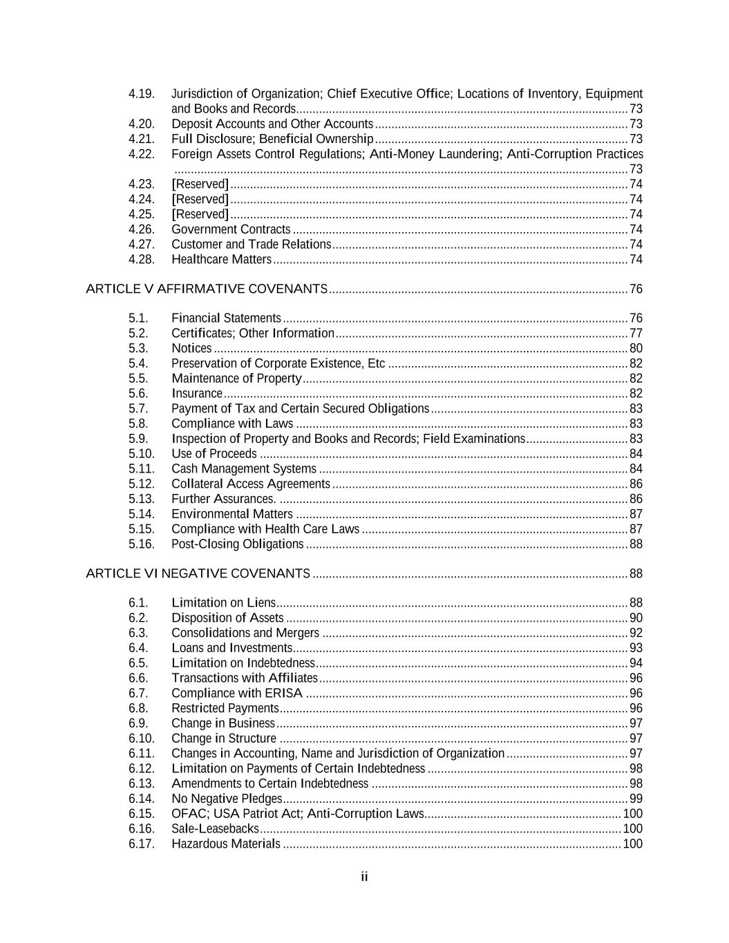 ii 4.19. Jurisdiction of Organization; Chief Executive Office; Locations of Inventory, Equipment and Books and Records ..................................................................................................... 73 4.20. Deposit Accounts and Other Accounts ............................................................................. 73 4.21. Full Disclosure; Beneficial Ownership ............................................................................. 73 4.22. Foreign Assets Control Regulations; Anti-Money Laundering; Anti-Corruption Practices .......................................................................................................................................... 73 4.23. [Reserved] ......................................................................................................................... 74 4.24. [Reserved] ......................................................................................................................... 74 4.25. [Reserved] ......................................................................................................................... 74 4.26. Government Contracts ...................................................................................................... 74 4.27. Customer and Trade Relations .......................................................................................... 74 4.28. Healthcare Matters ............................................................................................................ 74 ARTICLE V AFFIRMATIVE COVENANTS ........................................................................................... 76 5.1. Financial Statements ......................................................................................................... 76 5.2. Certificates; Other Information ......................................................................................... 77 5.3. Notices .............................................................................................................................. 80 5.4. Preservation of Corporate Existence, Etc ......................................................................... 82 5.5. Maintenance of Property ................................................................................................... 82 5.6. Insurance ........................................................................................................................... 82 5.7. Payment of Tax and Certain Secured Obligations ............................................................ 83 5.8. Compliance with Laws ..................................................................................................... 83 5.9. Inspection of Property and Books and Records; Field Examinations ............................... 83 5.10. Use of Proceeds ................................................................................................................ 84 5.11. Cash Management Systems .............................................................................................. 84 5.12. Collateral Access Agreements .......................................................................................... 86 5.13. Further Assurances. .......................................................................................................... 86 5.14. Environmental Matters ..................................................................................................... 87 5.15. Compliance with Health Care Laws ................................................................................. 87 5.16. Post-Closing Obligations .................................................................................................. 88 ARTICLE VI NEGATIVE COVENANTS ................................................................................................ 88 6.1. Limitation on Liens ........................................................................................................... 88 6.2. Disposition of Assets ........................................................................................................ 90 6.3. Consolidations and Mergers ............................................................................................. 92 6.4. Loans and Investments ...................................................................................................... 93 6.5. Limitation on Indebtedness ............................................................................................... 94 6.6. Transactions with Affiliates .............................................................................................. 96 6.7. Compliance with ERISA .................................................................................................. 96 6.8. Restricted Payments .......................................................................................................... 96 6.9. Change in Business ........................................................................................................... 97 6.10. Change in Structure .......................................................................................................... 97 6.11. Changes in Accounting, Name and Jurisdiction of Organization ..................................... 97 6.12. Limitation on Payments of Certain Indebtedness ............................................................. 98 6.13. Amendments to Certain Indebtedness .............................................................................. 98 6.14. No Negative Pledges ......................................................................................................... 99 6.15. OFAC; USA Patriot Act; Anti-Corruption Laws ............................................................ 100 6.16. Sale-Leasebacks .............................................................................................................. 100 6.17. Hazardous Materials ..........................................