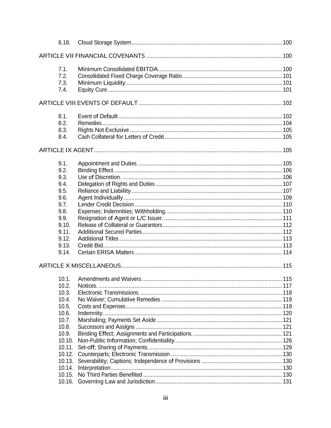 iii 6.18. Cloud Storage System ..................................................................................................... 100 ARTICLE VII FINANCIAL COVENANTS ........................................................................................... 100 7.1. Minimum Consolidated EBITDA ................................................................................... 100 7.2. Consolidated Fixed Charge Coverage Ratio ................................................................... 101 7.3. Minimum Liquidity ......................................................................................................... 101 7.4. Equity Cure ..................................................................................................................... 101 ARTICLE VIII EVENTS OF DEFAULT ................................................................................................ 102 8.1. Event of Default .............................................................................................................. 102 8.2. Remedies ......................................................................................................................... 104 8.3. Rights Not Exclusive ...................................................................................................... 105 8.4. Cash Collateral for Letters of Credit ............................................................................... 105 ARTICLE IX AGENT .............................................................................................................................. 105 9.1. Appointment and Duties. ................................................................................................ 105 9.2. Binding Effect ................................................................................................................. 106 9.3. Use of Discretion. ........................................................................................................... 106 9.4. Delegation of Rights and Duties ..................................................................................... 107 9.5. Reliance and Liability ..................................................................................................... 107 9.6. Agent Individually .......................................................................................................... 109 9.7. Lender Credit Decision ................................................................................................... 110 9.8. Expenses; Indemnities; Withholding. ............................................................................. 110 9.9. Resignation of Agent or L/C Issuer. ............................................................................... 111 9.10. Release of Collateral or Guarantors ................................................................................ 112 9.11. Additional Secured Parties .............................................................................................. 112 9.12. Additional Titles ............................................................................................................. 113 9.13. Credit Bid ........................................................................................................................ 113 9.14. Certain ERISA Matters ................................................................................................... 114 ARTICLE X MISCELLANEOUS............................................................................................................ 115 10.1. Amendments and Waivers. ............................................................................................. 115 10.2. Notices. ........................................................................................................................... 117 10.3. Electronic Transmissions. ............................................................................................... 118 10.4. No Waiver; Cumulative Remedies ................................................................................. 119 10.5. Costs and Expenses ......................................................................................................... 119 10.6. Indemnity. ....................................................................................................................... 120 10.7. Marshaling; Payments Set Aside .................................................................................... 121 10.8. Successors and Assigns .................................................................................................. 121 10.9. Binding Effect; Assignments and Participations. ........................................................... 121 10.10. Non-Public Information; Confidentiality. ....................................................................... 126 10.11. Set-off; Sharing of Payments. ......................................................................................... 129 10.12. Counterparts; Electronic Transmission ........................................................................... 130 10.13. Severability; Captions; Independence of Provisions ...................................................... 130 10.14. Interpretation ................................................................................................................... 130 10.15. No Third Parties Benefited ............................................................................................. 130 10.16. Governing Law and Jurisdiction ..................................................................................... 131
