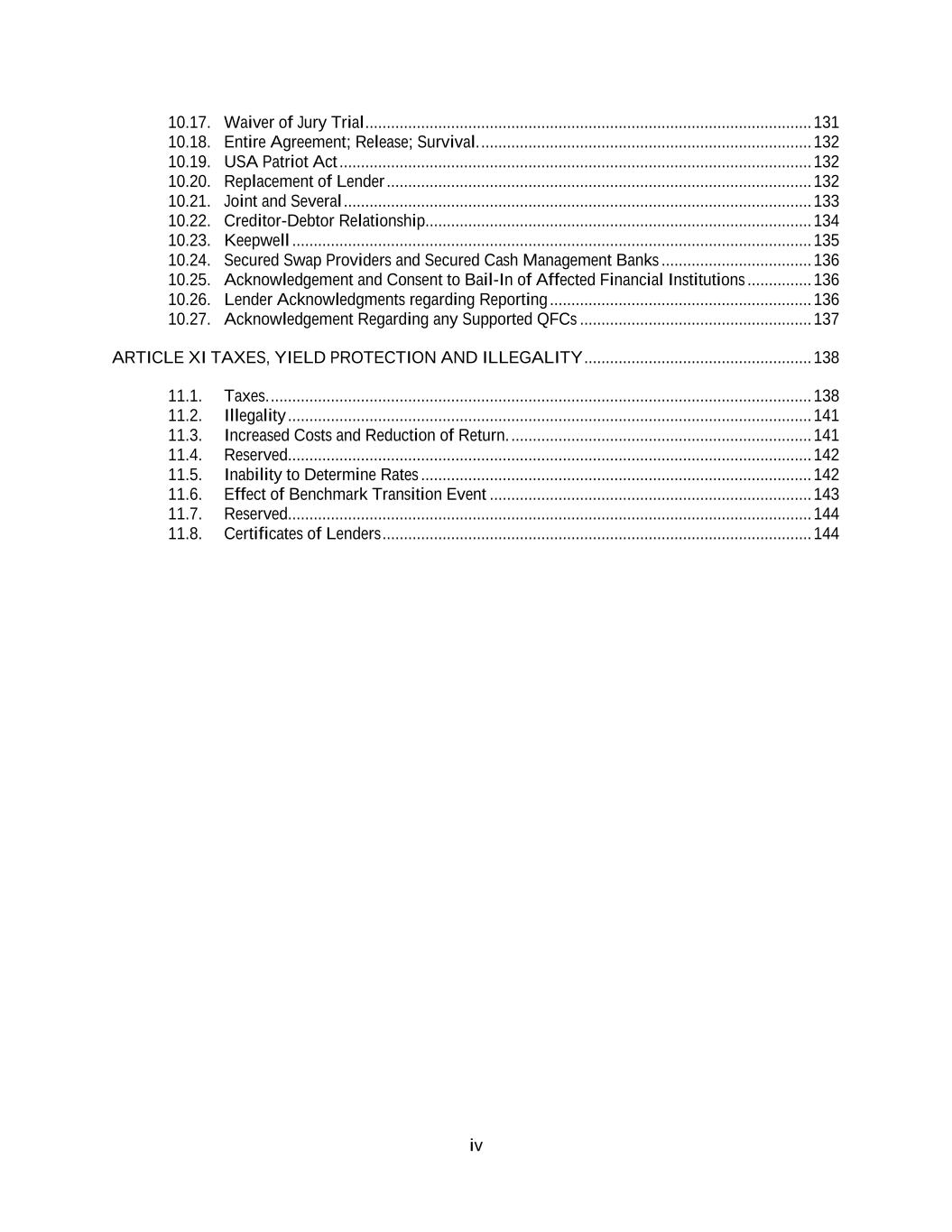 iv 10.17. Waiver of Jury Trial ........................................................................................................ 131 10.18. Entire Agreement; Release; Survival. ............................................................................. 132 10.19. USA Patriot Act .............................................................................................................. 132 10.20. Replacement of Lender ................................................................................................... 132 10.21. Joint and Several ............................................................................................................. 133 10.22. Creditor-Debtor Relationship.......................................................................................... 134 10.23. Keepwell ......................................................................................................................... 135 10.24. Secured Swap Providers and Secured Cash Management Banks ................................... 136 10.25. Acknowledgement and Consent to Bail-In of Affected Financial Institutions ............... 136 10.26. Lender Acknowledgments regarding Reporting ............................................................. 136 10.27. Acknowledgement Regarding any Supported QFCs ...................................................... 137 ARTICLE XI TAXES, YIELD PROTECTION AND ILLEGALITY ..................................................... 138 11.1. Taxes. .............................................................................................................................. 138 11.2. Illegality .......................................................................................................................... 141 11.3. Increased Costs and Reduction of Return. ...................................................................... 141 11.4. Reserved.......................................................................................................................... 142 11.5. Inability to Determine Rates ........................................................................................... 142 11.6. Effect of Benchmark Transition Event ........................................................................... 143 11.7. Reserved.......................................................................................................................... 144 11.8. Certificates of Lenders .................................................................................................... 144
