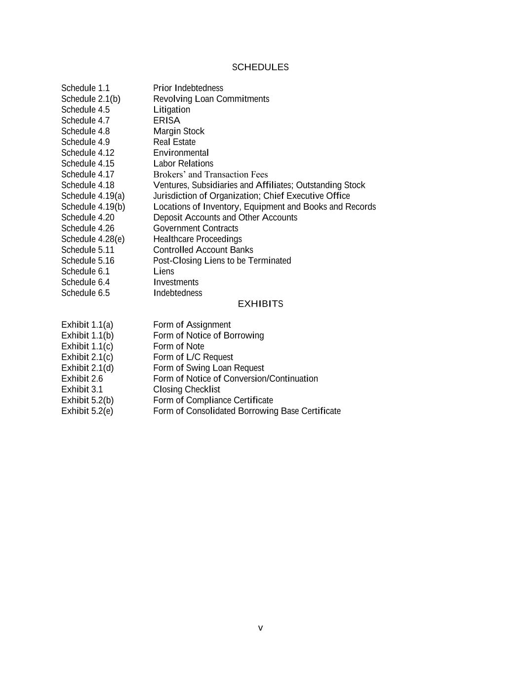 v SCHEDULES Schedule 1.1 Prior Indebtedness Schedule 2.1(b) Revolving Loan Commitments Schedule 4.5 Litigation Schedule 4.7 ERISA Schedule 4.8 Margin Stock Schedule 4.9 Real Estate Schedule 4.12 Environmental Schedule 4.15 Labor Relations Schedule 4.17 Brokers’ and Transaction Fees Schedule 4.18 Ventures, Subsidiaries and Affiliates; Outstanding Stock Schedule 4.19(a) Jurisdiction of Organization; Chief Executive Office Schedule 4.19(b) Locations of Inventory, Equipment and Books and Records Schedule 4.20 Deposit Accounts and Other Accounts Schedule 4.26 Government Contracts Schedule 4.28(e) Healthcare Proceedings Schedule 5.11 Controlled Account Banks Schedule 5.16 Post-Closing Liens to be Terminated Schedule 6.1 Liens Schedule 6.4 Investments Schedule 6.5 Indebtedness EXHIBITS Exhibit 1.1(a) Form of Assignment Exhibit 1.1(b) Form of Notice of Borrowing Exhibit 1.1(c) Form of Note Exhibit 2.1(c) Form of L/C Request Exhibit 2.1(d) Form of Swing Loan Request Exhibit 2.6 Form of Notice of Conversion/Continuation Exhibit 3.1 Closing Checklist Exhibit 5.2(b) Form of Compliance Certificate Exhibit 5.2(e) Form of Consolidated Borrowing Base Certificate