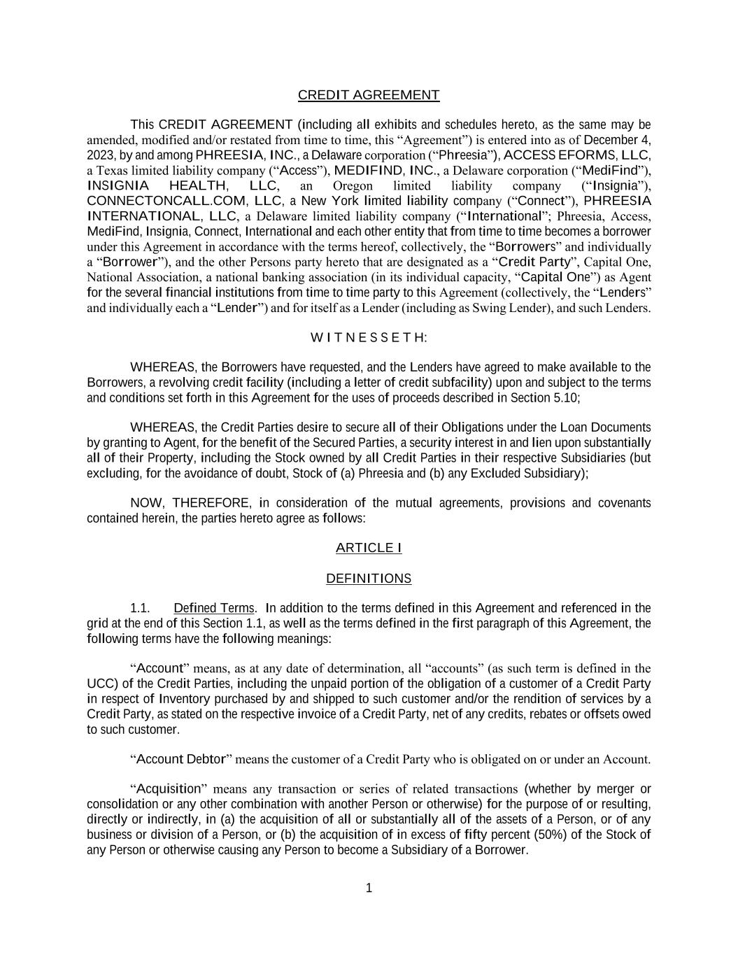 1 CREDIT AGREEMENT This CREDIT AGREEMENT (including all exhibits and schedules hereto, as the same may be amended, modified and/or restated from time to time, this “Agreement”) is entered into as of December 4, 2023, by and among PHREESIA, INC., a Delaware corporation (“Phreesia”), ACCESS EFORMS, LLC, a Texas limited liability company (“Access”), MEDIFIND, INC., a Delaware corporation (“MediFind”), INSIGNIA HEALTH, LLC, an Oregon limited liability company (“Insignia”), CONNECTONCALL.COM, LLC, a New York limited liability company (“Connect”), PHREESIA INTERNATIONAL, LLC, a Delaware limited liability company (“International”; Phreesia, Access, MediFind, Insignia, Connect, International and each other entity that from time to time becomes a borrower under this Agreement in accordance with the terms hereof, collectively, the “Borrowers” and individually a “Borrower”), and the other Persons party hereto that are designated as a “Credit Party”, Capital One, National Association, a national banking association (in its individual capacity, “Capital One”) as Agent for the several financial institutions from time to time party to this Agreement (collectively, the “Lenders” and individually each a “Lender”) and for itself as a Lender (including as Swing Lender), and such Lenders. W I T N E S S E T H: WHEREAS, the Borrowers have requested, and the Lenders have agreed to make available to the Borrowers, a revolving credit facility (including a letter of credit subfacility) upon and subject to the terms and conditions set forth in this Agreement for the uses of proceeds described in Section 5.10; WHEREAS, the Credit Parties desire to secure all of their Obligations under the Loan Documents by granting to Agent, for the benefit of the Secured Parties, a security interest in and lien upon substantially all of their Property, including the Stock owned by all Credit Parties in their respective Subsidiaries (but excluding, for the avoidance of doubt, Stock of (a) Phreesia and (b) any Excluded Subsidiary); NOW, THEREFORE, in consideration of the mutual agreements, provisions and covenants contained herein, the parties hereto agree as follows: ARTICLE I DEFINITIONS 1.1. Defined Terms. In addition to the terms defined in this Agreement and referenced in the grid at the end of this Section 1.1, as well as the terms defined in the first paragraph of this Agreement, the following terms have the following meanings: “Account” means, as at any date of determination, all “accounts” (as such term is defined in the UCC) of the Credit Parties, including the unpaid portion of the obligation of a customer of a Credit Party in respect of Inventory purchased by and shipped to such customer and/or the rendition of services by a Credit Party, as stated on the respective invoice of a Credit Party, net of any credits, rebates or offsets owed to such customer. “Account Debtor” means the customer of a Credit Party who is obligated on or under an Account. “Acquisition” means any transaction or series of related transactions (whether by merger or consolidation or any other combination with another Person or otherwise) for the purpose of or resulting, directly or indirectly, in (a) the acquisition of all or substantially all of the assets of a Person, or of any business or division of a Person, or (b) the acquisition of in excess of fifty percent (50%) of the Stock of any Person or otherwise causing any Person to become a Subsidiary of a Borrower.