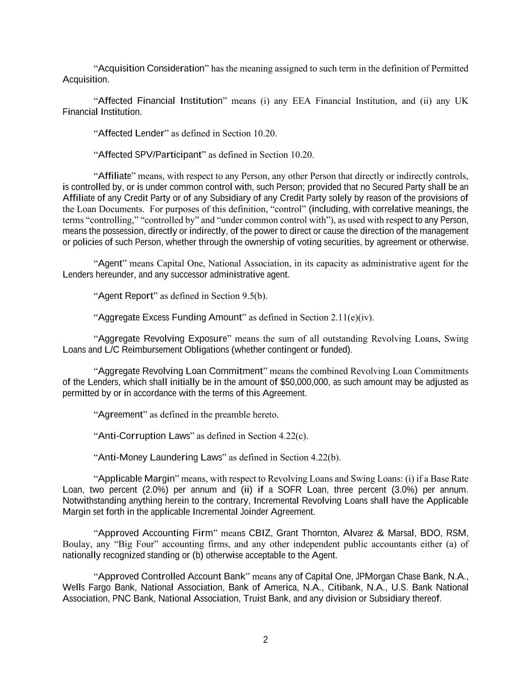 2 “Acquisition Consideration” has the meaning assigned to such term in the definition of Permitted Acquisition. “Affected Financial Institution” means (i) any EEA Financial Institution, and (ii) any UK Financial Institution. “Affected Lender” as defined in Section 10.20. “Affected SPV/Participant” as defined in Section 10.20. “Affiliate” means, with respect to any Person, any other Person that directly or indirectly controls, is controlled by, or is under common control with, such Person; provided that no Secured Party shall be an Affiliate of any Credit Party or of any Subsidiary of any Credit Party solely by reason of the provisions of the Loan Documents. For purposes of this definition, “control” (including, with correlative meanings, the terms “controlling,” “controlled by” and “under common control with”), as used with respect to any Person, means the possession, directly or indirectly, of the power to direct or cause the direction of the management or policies of such Person, whether through the ownership of voting securities, by agreement or otherwise. “Agent” means Capital One, National Association, in its capacity as administrative agent for the Lenders hereunder, and any successor administrative agent. “Agent Report” as defined in Section 9.5(b). “Aggregate Excess Funding Amount” as defined in Section 2.11(e)(iv). “Aggregate Revolving Exposure” means the sum of all outstanding Revolving Loans, Swing Loans and L/C Reimbursement Obligations (whether contingent or funded). “Aggregate Revolving Loan Commitment” means the combined Revolving Loan Commitments of the Lenders, which shall initially be in the amount of $50,000,000, as such amount may be adjusted as permitted by or in accordance with the terms of this Agreement. “Agreement” as defined in the preamble hereto. “Anti-Corruption Laws” as defined in Section 4.22(c). “Anti-Money Laundering Laws” as defined in Section 4.22(b). “Applicable Margin” means, with respect to Revolving Loans and Swing Loans: (i) if a Base Rate Loan, two percent (2.0%) per annum and (ii) if a SOFR Loan, three percent (3.0%) per annum. Notwithstanding anything herein to the contrary, Incremental Revolving Loans shall have the Applicable Margin set forth in the applicable Incremental Joinder Agreement. “Approved Accounting Firm” means CBIZ, Grant Thornton, Alvarez & Marsal, BDO, RSM, Boulay, any “Big Four” accounting firms, and any other independent public accountants either (a) of nationally recognized standing or (b) otherwise acceptable to the Agent. “Approved Controlled Account Bank” means any of Capital One, JPMorgan Chase Bank, N.A., Wells Fargo Bank, National Association, Bank of America, N.A., Citibank, N.A., U.S. Bank National Association, PNC Bank, National Association, Truist Bank, and any division or Subsidiary thereof.