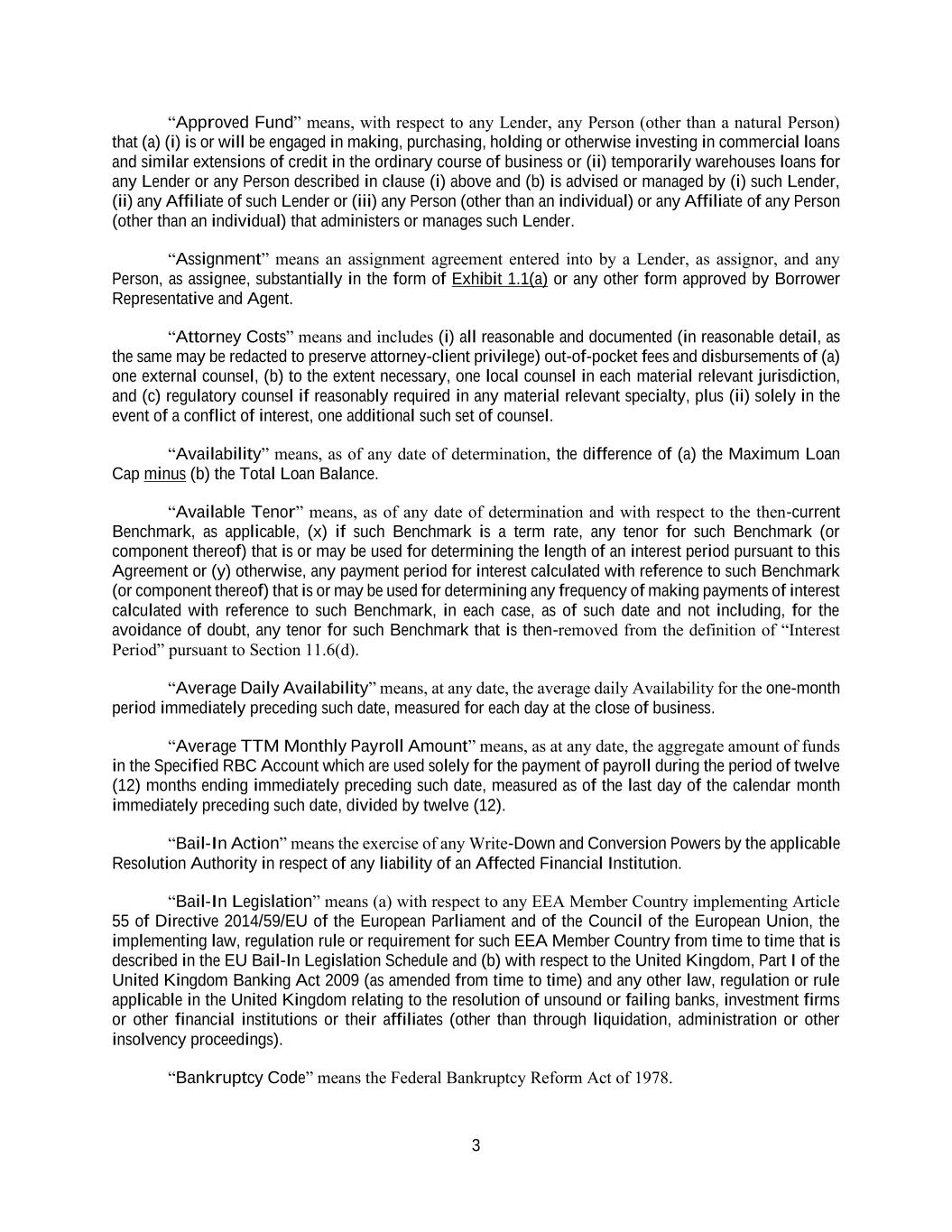 3 “Approved Fund” means, with respect to any Lender, any Person (other than a natural Person) that (a) (i) is or will be engaged in making, purchasing, holding or otherwise investing in commercial loans and similar extensions of credit in the ordinary course of business or (ii) temporarily warehouses loans for any Lender or any Person described in clause (i) above and (b) is advised or managed by (i) such Lender, (ii) any Affiliate of such Lender or (iii) any Person (other than an individual) or any Affiliate of any Person (other than an individual) that administers or manages such Lender. “Assignment” means an assignment agreement entered into by a Lender, as assignor, and any Person, as assignee, substantially in the form of Exhibit 1.1(a) or any other form approved by Borrower Representative and Agent. “Attorney Costs” means and includes (i) all reasonable and documented (in reasonable detail, as the same may be redacted to preserve attorney-client privilege) out-of-pocket fees and disbursements of (a) one external counsel, (b) to the extent necessary, one local counsel in each material relevant jurisdiction, and (c) regulatory counsel if reasonably required in any material relevant specialty, plus (ii) solely in the event of a conflict of interest, one additional such set of counsel. “Availability” means, as of any date of determination, the difference of (a) the Maximum Loan Cap minus (b) the Total Loan Balance. “Available Tenor” means, as of any date of determination and with respect to the then-current Benchmark, as applicable, (x) if such Benchmark is a term rate, any tenor for such Benchmark (or component thereof) that is or may be used for determining the length of an interest period pursuant to this Agreement or (y) otherwise, any payment period for interest calculated with reference to such Benchmark (or component thereof) that is or may be used for determining any frequency of making payments of interest calculated with reference to such Benchmark, in each case, as of such date and not including, for the avoidance of doubt, any tenor for such Benchmark that is then-removed from the definition of “Interest Period” pursuant to Section 11.6(d). “Average Daily Availability” means, at any date, the average daily Availability for the one-month period immediately preceding such date, measured for each day at the close of business. “Average TTM Monthly Payroll Amount” means, as at any date, the aggregate amount of funds in the Specified RBC Account which are used solely for the payment of payroll during the period of twelve (12) months ending immediately preceding such date, measured as of the last day of the calendar month immediately preceding such date, divided by twelve (12). “Bail-In Action” means the exercise of any Write-Down and Conversion Powers by the applicable Resolution Authority in respect of any liability of an Affected Financial Institution. “Bail-In Legislation” means (a) with respect to any EEA Member Country implementing Article 55 of Directive 2014/59/EU of the European Parliament and of the Council of the European Union, the implementing law, regulation rule or requirement for such EEA Member Country from time to time that is described in the EU Bail-In Legislation Schedule and (b) with respect to the United Kingdom, Part I of the United Kingdom Banking Act 2009 (as amended from time to time) and any other law, regulation or rule applicable in the United Kingdom relating to the resolution of unsound or failing banks, investment firms or other financial institutions or their affiliates (other than through liquidation, administration or other insolvency proceedings). “Bankruptcy Code” means the Federal Bankruptcy Reform Act of 1978.