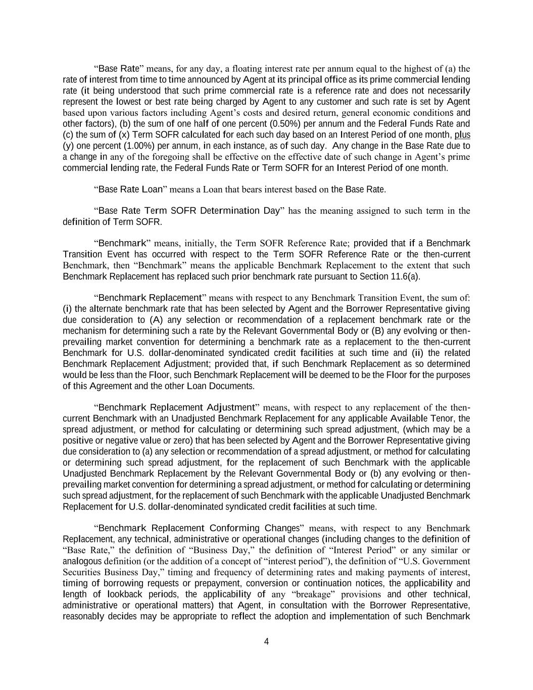 4 “Base Rate” means, for any day, a floating interest rate per annum equal to the highest of (a) the rate of interest from time to time announced by Agent at its principal office as its prime commercial lending rate (it being understood that such prime commercial rate is a reference rate and does not necessarily represent the lowest or best rate being charged by Agent to any customer and such rate is set by Agent based upon various factors including Agent’s costs and desired return, general economic conditions and other factors), (b) the sum of one half of one percent (0.50%) per annum and the Federal Funds Rate and (c) the sum of (x) Term SOFR calculated for each such day based on an Interest Period of one month, plus (y) one percent (1.00%) per annum, in each instance, as of such day. Any change in the Base Rate due to a change in any of the foregoing shall be effective on the effective date of such change in Agent’s prime commercial lending rate, the Federal Funds Rate or Term SOFR for an Interest Period of one month. “Base Rate Loan” means a Loan that bears interest based on the Base Rate. “Base Rate Term SOFR Determination Day” has the meaning assigned to such term in the definition of Term SOFR. “Benchmark” means, initially, the Term SOFR Reference Rate; provided that if a Benchmark Transition Event has occurred with respect to the Term SOFR Reference Rate or the then-current Benchmark, then “Benchmark” means the applicable Benchmark Replacement to the extent that such Benchmark Replacement has replaced such prior benchmark rate pursuant to Section 11.6(a). “Benchmark Replacement” means with respect to any Benchmark Transition Event, the sum of: (i) the alternate benchmark rate that has been selected by Agent and the Borrower Representative giving due consideration to (A) any selection or recommendation of a replacement benchmark rate or the mechanism for determining such a rate by the Relevant Governmental Body or (B) any evolving or then- prevailing market convention for determining a benchmark rate as a replacement to the then-current Benchmark for U.S. dollar-denominated syndicated credit facilities at such time and (ii) the related Benchmark Replacement Adjustment; provided that, if such Benchmark Replacement as so determined would be less than the Floor, such Benchmark Replacement will be deemed to be the Floor for the purposes of this Agreement and the other Loan Documents. “Benchmark Replacement Adjustment” means, with respect to any replacement of the then- current Benchmark with an Unadjusted Benchmark Replacement for any applicable Available Tenor, the spread adjustment, or method for calculating or determining such spread adjustment, (which may be a positive or negative value or zero) that has been selected by Agent and the Borrower Representative giving due consideration to (a) any selection or recommendation of a spread adjustment, or method for calculating or determining such spread adjustment, for the replacement of such Benchmark with the applicable Unadjusted Benchmark Replacement by the Relevant Governmental Body or (b) any evolving or then- prevailing market convention for determining a spread adjustment, or method for calculating or determining such spread adjustment, for the replacement of such Benchmark with the applicable Unadjusted Benchmark Replacement for U.S. dollar-denominated syndicated credit facilities at such time. “Benchmark Replacement Conforming Changes” means, with respect to any Benchmark Replacement, any technical, administrative or operational changes (including changes to the definition of “Base Rate,” the definition of “Business Day,” the definition of “Interest Period” or any similar or analogous definition (or the addition of a concept of “interest period”), the definition of “U.S. Government Securities Business Day,” timing and frequency of determining rates and making payments of interest, timing of borrowing requests or prepayment, conversion or continuation notices, the applicability and length of lookback periods, the applicability of any “breakage” provisions and other technical, administrative or operational matters) that Agent, in consultation with the Borrower Representative, reasonably decides may be appropriate to reflect the adoption and implementation of such Benchmark
