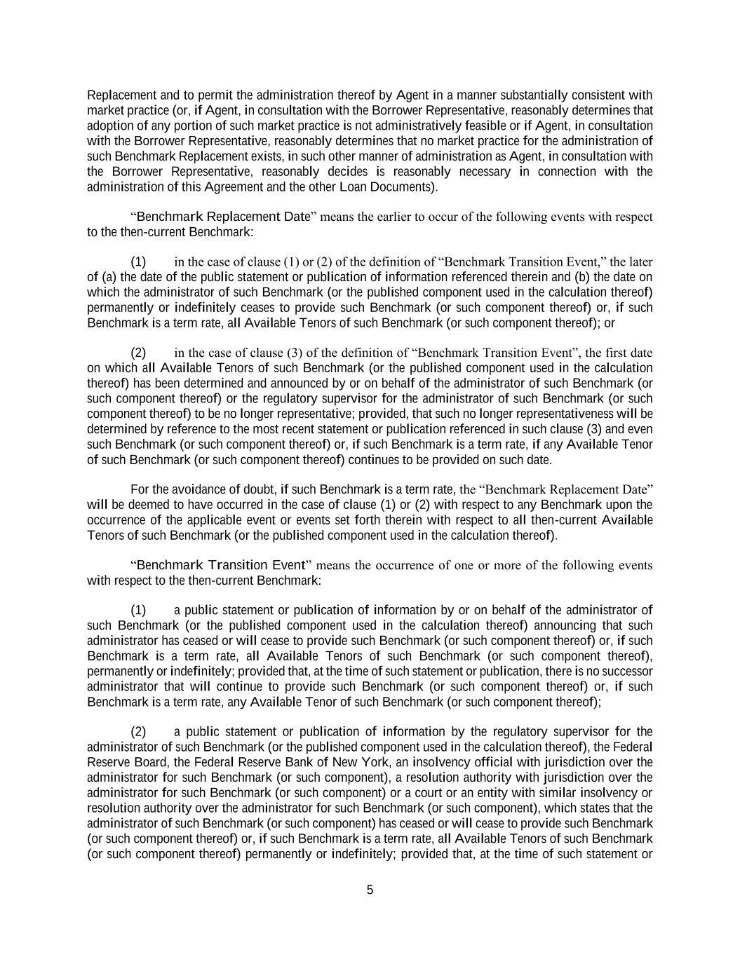 5 Replacement and to permit the administration thereof by Agent in a manner substantially consistent with market practice (or, if Agent, in consultation with the Borrower Representative, reasonably determines that adoption of any portion of such market practice is not administratively feasible or if Agent, in consultation with the Borrower Representative, reasonably determines that no market practice for the administration of such Benchmark Replacement exists, in such other manner of administration as Agent, in consultation with the Borrower Representative, reasonably decides is reasonably necessary in connection with the administration of this Agreement and the other Loan Documents). “Benchmark Replacement Date” means the earlier to occur of the following events with respect to the then-current Benchmark: (1) in the case of clause (1) or (2) of the definition of “Benchmark Transition Event,” the later of (a) the date of the public statement or publication of information referenced therein and (b) the date on which the administrator of such Benchmark (or the published component used in the calculation thereof) permanently or indefinitely ceases to provide such Benchmark (or such component thereof) or, if such Benchmark is a term rate, all Available Tenors of such Benchmark (or such component thereof); or (2) in the case of clause (3) of the definition of “Benchmark Transition Event”, the first date on which all Available Tenors of such Benchmark (or the published component used in the calculation thereof) has been determined and announced by or on behalf of the administrator of such Benchmark (or such component thereof) or the regulatory supervisor for the administrator of such Benchmark (or such component thereof) to be no longer representative; provided, that such no longer representativeness will be determined by reference to the most recent statement or publication referenced in such clause (3) and even such Benchmark (or such component thereof) or, if such Benchmark is a term rate, if any Available Tenor of such Benchmark (or such component thereof) continues to be provided on such date. For the avoidance of doubt, if such Benchmark is a term rate, the “Benchmark Replacement Date” will be deemed to have occurred in the case of clause (1) or (2) with respect to any Benchmark upon the occurrence of the applicable event or events set forth therein with respect to all then-current Available Tenors of such Benchmark (or the published component used in the calculation thereof). “Benchmark Transition Event” means the occurrence of one or more of the following events with respect to the then-current Benchmark: (1) a public statement or publication of information by or on behalf of the administrator of such Benchmark (or the published component used in the calculation thereof) announcing that such administrator has ceased or will cease to provide such Benchmark (or such component thereof) or, if such Benchmark is a term rate, all Available Tenors of such Benchmark (or such component thereof), permanently or indefinitely; provided that, at the time of such statement or publication, there is no successor administrator that will continue to provide such Benchmark (or such component thereof) or, if such Benchmark is a term rate, any Available Tenor of such Benchmark (or such component thereof); (2) a public statement or publication of information by the regulatory supervisor for the administrator of such Benchmark (or the published component used in the calculation thereof), the Federal Reserve Board, the Federal Reserve Bank of New York, an insolvency official with jurisdiction over the administrator for such Benchmark (or such component), a resolution authority with jurisdiction over the administrator for such Benchmark (or such component) or a court or an entity with similar insolvency or resolution authority over the administrator for such Benchmark (or such component), which states that the administrator of such Benchmark (or such component) has ceased or will cease to provide such Benchmark (or such component thereof) or, if such Benchmark is a term rate, all Available Tenors of such Benchmark (or such component thereof) permanently or indefinitely; provided that, at the time of such statement or