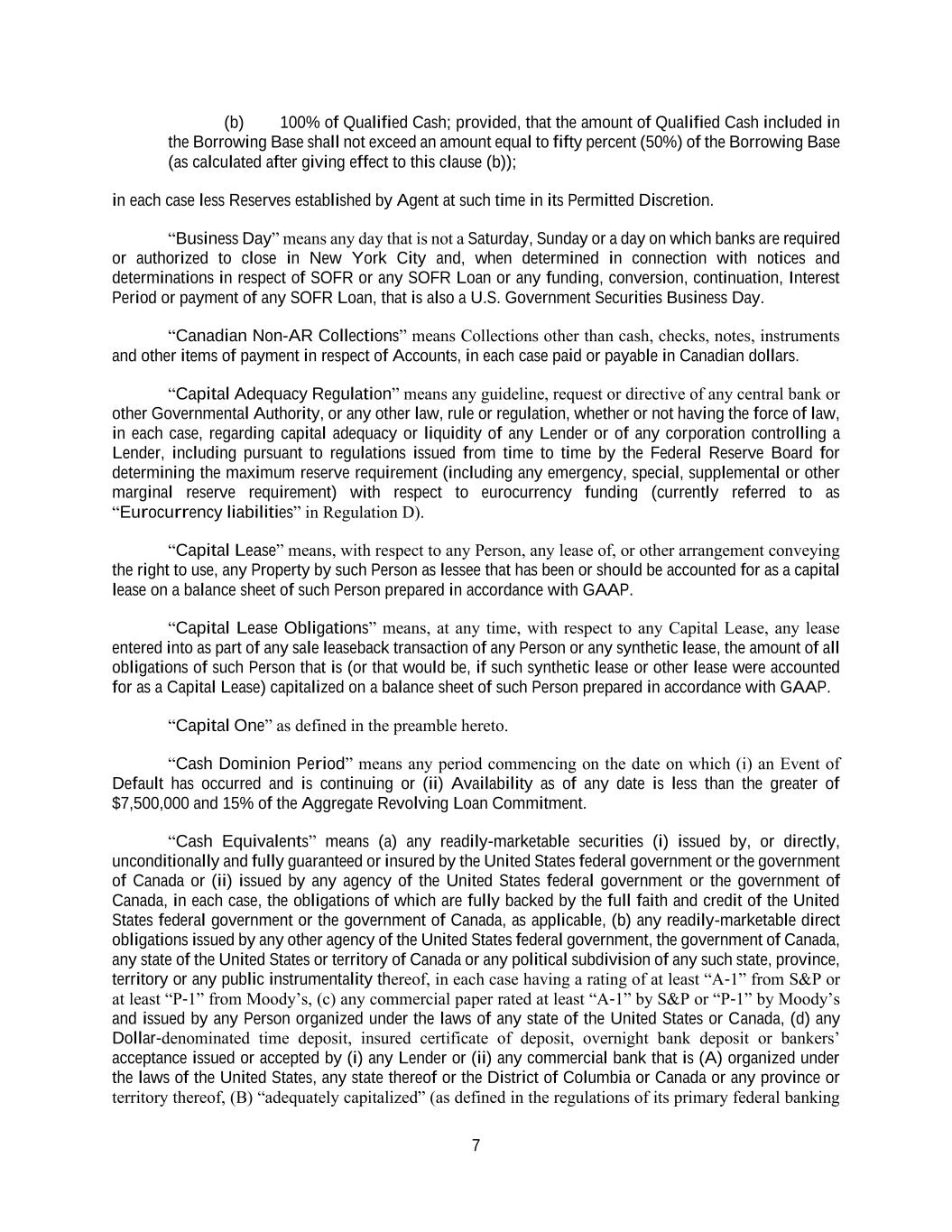 7 (b) 100% of Qualified Cash; provided, that the amount of Qualified Cash included in the Borrowing Base shall not exceed an amount equal to fifty percent (50%) of the Borrowing Base (as calculated after giving effect to this clause (b)); in each case less Reserves established by Agent at such time in its Permitted Discretion. “Business Day” means any day that is not a Saturday, Sunday or a day on which banks are required or authorized to close in New York City and, when determined in connection with notices and determinations in respect of SOFR or any SOFR Loan or any funding, conversion, continuation, Interest Period or payment of any SOFR Loan, that is also a U.S. Government Securities Business Day. “Canadian Non-AR Collections” means Collections other than cash, checks, notes, instruments and other items of payment in respect of Accounts, in each case paid or payable in Canadian dollars. “Capital Adequacy Regulation” means any guideline, request or directive of any central bank or other Governmental Authority, or any other law, rule or regulation, whether or not having the force of law, in each case, regarding capital adequacy or liquidity of any Lender or of any corporation controlling a Lender, including pursuant to regulations issued from time to time by the Federal Reserve Board for determining the maximum reserve requirement (including any emergency, special, supplemental or other marginal reserve requirement) with respect to eurocurrency funding (currently referred to as “Eurocurrency liabilities” in Regulation D). “Capital Lease” means, with respect to any Person, any lease of, or other arrangement conveying the right to use, any Property by such Person as lessee that has been or should be accounted for as a capital lease on a balance sheet of such Person prepared in accordance with GAAP. “Capital Lease Obligations” means, at any time, with respect to any Capital Lease, any lease entered into as part of any sale leaseback transaction of any Person or any synthetic lease, the amount of all obligations of such Person that is (or that would be, if such synthetic lease or other lease were accounted for as a Capital Lease) capitalized on a balance sheet of such Person prepared in accordance with GAAP. “Capital One” as defined in the preamble hereto. “Cash Dominion Period” means any period commencing on the date on which (i) an Event of Default has occurred and is continuing or (ii) Availability as of any date is less than the greater of $7,500,000 and 15% of the Aggregate Revolving Loan Commitment. “Cash Equivalents” means (a) any readily-marketable securities (i) issued by, or directly, unconditionally and fully guaranteed or insured by the United States federal government or the government of Canada or (ii) issued by any agency of the United States federal government or the government of Canada, in each case, the obligations of which are fully backed by the full faith and credit of the United States federal government or the government of Canada, as applicable, (b) any readily-marketable direct obligations issued by any other agency of the United States federal government, the government of Canada, any state of the United States or territory of Canada or any political subdivision of any such state, province, territory or any public instrumentality thereof, in each case having a rating of at least “A-1” from S&P or at least “P-1” from Moody’s, (c) any commercial paper rated at least “A-1” by S&P or “P-1” by Moody’s and issued by any Person organized under the laws of any state of the United States or Canada, (d) any Dollar-denominated time deposit, insured certificate of deposit, overnight bank deposit or bankers’ acceptance issued or accepted by (i) any Lender or (ii) any commercial bank that is (A) organized under the laws of the United States, any state thereof or the District of Columbia or Canada or any province or territory thereof, (B) “adequately capitalized” (as defined in the regulations of its primary federal banking