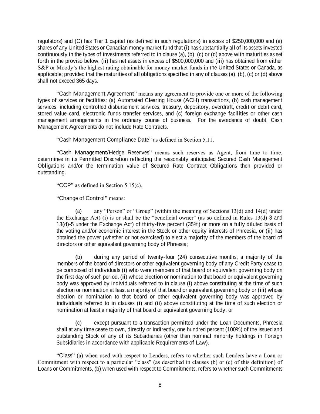 8 regulators) and (C) has Tier 1 capital (as defined in such regulations) in excess of $250,000,000 and (e) shares of any United States or Canadian money market fund that (i) has substantially all of its assets invested continuously in the types of investments referred to in clause (a), (b), (c) or (d) above with maturities as set forth in the proviso below, (ii) has net assets in excess of $500,000,000 and (iii) has obtained from either S&P or Moody’s the highest rating obtainable for money market funds in the United States or Canada, as applicable; provided that the maturities of all obligations specified in any of clauses (a), (b), (c) or (d) above shall not exceed 365 days. “Cash Management Agreement” means any agreement to provide one or more of the following types of services or facilities: (a) Automated Clearing House (ACH) transactions, (b) cash management services, including controlled disbursement services, treasury, depository, overdraft, credit or debit card, stored value card, electronic funds transfer services, and (c) foreign exchange facilities or other cash management arrangements in the ordinary course of business. For the avoidance of doubt, Cash Management Agreements do not include Rate Contracts. “Cash Management Compliance Date” as defined in Section 5.11. “Cash Management/Hedge Reserves” means such reserves as Agent, from time to time, determines in its Permitted Discretion reflecting the reasonably anticipated Secured Cash Management Obligations and/or the termination value of Secured Rate Contract Obligations then provided or outstanding. “CCP” as defined in Section 5.15(c). “Change of Control” means: (a) any “Person” or “Group” (within the meaning of Sections 13(d) and 14(d) under the Exchange Act) (i) is or shall be the “beneficial owner” (as so defined in Rules 13(d)-3 and 13(d)-5 under the Exchange Act) of thirty-five percent (35%) or more on a fully diluted basis of the voting and/or economic interest in the Stock or other equity interests of Phreesia, or (ii) has obtained the power (whether or not exercised) to elect a majority of the members of the board of directors or other equivalent governing body of Phreesia; (b) during any period of twenty-four (24) consecutive months, a majority of the members of the board of directors or other equivalent governing body of any Credit Party cease to be composed of individuals (i) who were members of that board or equivalent governing body on the first day of such period, (ii) whose election or nomination to that board or equivalent governing body was approved by individuals referred to in clause (i) above constituting at the time of such election or nomination at least a majority of that board or equivalent governing body or (iii) whose election or nomination to that board or other equivalent governing body was approved by individuals referred to in clauses (i) and (ii) above constituting at the time of such election or nomination at least a majority of that board or equivalent governing body; or (c) except pursuant to a transaction permitted under the Loan Documents, Phreesia shall at any time cease to own, directly or indirectly, one hundred percent (100%) of the issued and outstanding Stock of any of its Subsidiaries (other than nominal minority holdings in Foreign Subsidiaries in accordance with applicable Requirements of Law). “Class” (a) when used with respect to Lenders, refers to whether such Lenders have a Loan or Commitment with respect to a particular “class” (as described in clauses (b) or (c) of this definition) of Loans or Commitments, (b) when used with respect to Commitments, refers to whether such Commitments