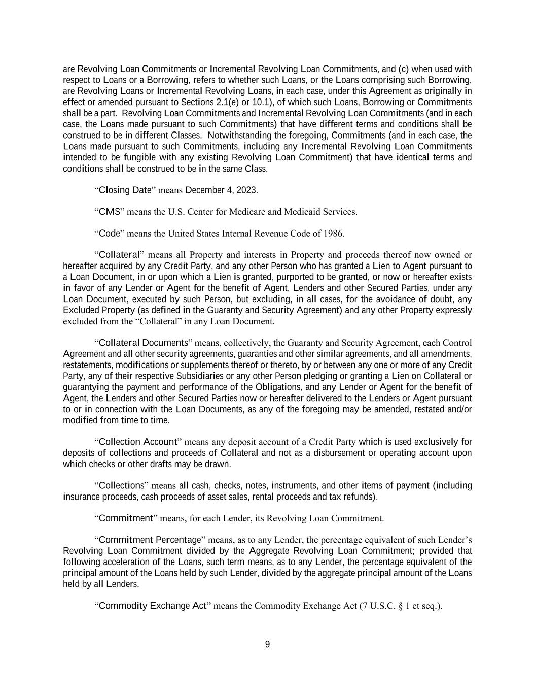9 are Revolving Loan Commitments or Incremental Revolving Loan Commitments, and (c) when used with respect to Loans or a Borrowing, refers to whether such Loans, or the Loans comprising such Borrowing, are Revolving Loans or Incremental Revolving Loans, in each case, under this Agreement as originally in effect or amended pursuant to Sections 2.1(e) or 10.1), of which such Loans, Borrowing or Commitments shall be a part. Revolving Loan Commitments and Incremental Revolving Loan Commitments (and in each case, the Loans made pursuant to such Commitments) that have different terms and conditions shall be construed to be in different Classes. Notwithstanding the foregoing, Commitments (and in each case, the Loans made pursuant to such Commitments, including any Incremental Revolving Loan Commitments intended to be fungible with any existing Revolving Loan Commitment) that have identical terms and conditions shall be construed to be in the same Class. “Closing Date” means December 4, 2023. “CMS” means the U.S. Center for Medicare and Medicaid Services. “Code” means the United States Internal Revenue Code of 1986. “Collateral” means all Property and interests in Property and proceeds thereof now owned or hereafter acquired by any Credit Party, and any other Person who has granted a Lien to Agent pursuant to a Loan Document, in or upon which a Lien is granted, purported to be granted, or now or hereafter exists in favor of any Lender or Agent for the benefit of Agent, Lenders and other Secured Parties, under any Loan Document, executed by such Person, but excluding, in all cases, for the avoidance of doubt, any Excluded Property (as defined in the Guaranty and Security Agreement) and any other Property expressly excluded from the “Collateral” in any Loan Document. “Collateral Documents” means, collectively, the Guaranty and Security Agreement, each Control Agreement and all other security agreements, guaranties and other similar agreements, and all amendments, restatements, modifications or supplements thereof or thereto, by or between any one or more of any Credit Party, any of their respective Subsidiaries or any other Person pledging or granting a Lien on Collateral or guarantying the payment and performance of the Obligations, and any Lender or Agent for the benefit of Agent, the Lenders and other Secured Parties now or hereafter delivered to the Lenders or Agent pursuant to or in connection with the Loan Documents, as any of the foregoing may be amended, restated and/or modified from time to time. “Collection Account” means any deposit account of a Credit Party which is used exclusively for deposits of collections and proceeds of Collateral and not as a disbursement or operating account upon which checks or other drafts may be drawn. “Collections” means all cash, checks, notes, instruments, and other items of payment (including insurance proceeds, cash proceeds of asset sales, rental proceeds and tax refunds). “Commitment” means, for each Lender, its Revolving Loan Commitment. “Commitment Percentage” means, as to any Lender, the percentage equivalent of such Lender’s Revolving Loan Commitment divided by the Aggregate Revolving Loan Commitment; provided that following acceleration of the Loans, such term means, as to any Lender, the percentage equivalent of the principal amount of the Loans held by such Lender, divided by the aggregate principal amount of the Loans held by all Lenders. “Commodity Exchange Act” means the Commodity Exchange Act (7 U.S.C. § 1 et seq.).