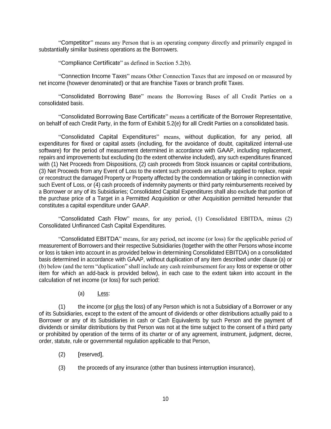 10 “Competitor” means any Person that is an operating company directly and primarily engaged in substantially similar business operations as the Borrowers. “Compliance Certificate” as defined in Section 5.2(b). “Connection Income Taxes” means Other Connection Taxes that are imposed on or measured by net income (however denominated) or that are franchise Taxes or branch profit Taxes. “Consolidated Borrowing Base” means the Borrowing Bases of all Credit Parties on a consolidated basis. “Consolidated Borrowing Base Certificate” means a certificate of the Borrower Representative, on behalf of each Credit Party, in the form of Exhibit 5.2(e) for all Credit Parties on a consolidated basis. “Consolidated Capital Expenditures” means, without duplication, for any period, all expenditures for fixed or capital assets (including, for the avoidance of doubt, capitalized internal-use software) for the period of measurement determined in accordance with GAAP, including replacement, repairs and improvements but excluding (to the extent otherwise included), any such expenditures financed with (1) Net Proceeds from Dispositions, (2) cash proceeds from Stock issuances or capital contributions, (3) Net Proceeds from any Event of Loss to the extent such proceeds are actually applied to replace, repair or reconstruct the damaged Property or Property affected by the condemnation or taking in connection with such Event of Loss, or (4) cash proceeds of indemnity payments or third party reimbursements received by a Borrower or any of its Subsidiaries; Consolidated Capital Expenditures shall also exclude that portion of the purchase price of a Target in a Permitted Acquisition or other Acquisition permitted hereunder that constitutes a capital expenditure under GAAP. “Consolidated Cash Flow” means, for any period, (1) Consolidated EBITDA, minus (2) Consolidated Unfinanced Cash Capital Expenditures. “Consolidated EBITDA” means, for any period, net income (or loss) for the applicable period of measurement of Borrowers and their respective Subsidiaries (together with the other Persons whose income or loss is taken into account in as provided below in determining Consolidated EBITDA) on a consolidated basis determined in accordance with GAAP, without duplication of any item described under clause (a) or (b) below (and the term “duplication” shall include any cash reimbursement for any loss or expense or other item for which an add-back is provided below), in each case to the extent taken into account in the calculation of net income (or loss) for such period: (a) Less: (1) the income (or plus the loss) of any Person which is not a Subsidiary of a Borrower or any of its Subsidiaries, except to the extent of the amount of dividends or other distributions actually paid to a Borrower or any of its Subsidiaries in cash or Cash Equivalents by such Person and the payment of dividends or similar distributions by that Person was not at the time subject to the consent of a third party or prohibited by operation of the terms of its charter or of any agreement, instrument, judgment, decree, order, statute, rule or governmental regulation applicable to that Person, (2) [reserved], (3) the proceeds of any insurance (other than business interruption insurance),