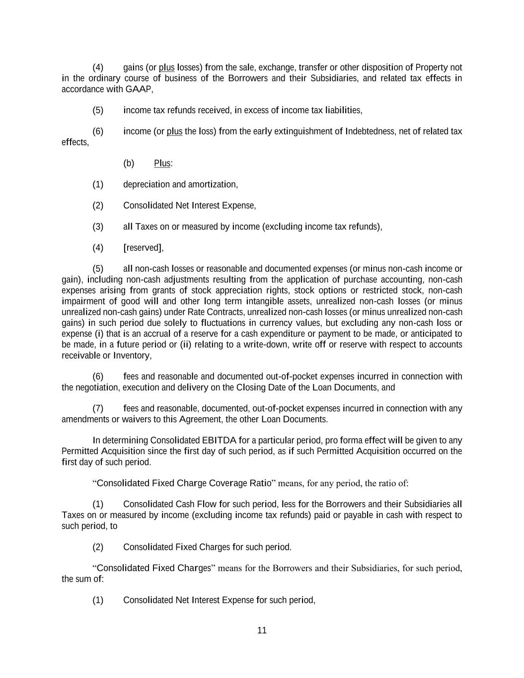 11 (4) gains (or plus losses) from the sale, exchange, transfer or other disposition of Property not in the ordinary course of business of the Borrowers and their Subsidiaries, and related tax effects in accordance with GAAP, (5) income tax refunds received, in excess of income tax liabilities, (6) income (or plus the loss) from the early extinguishment of Indebtedness, net of related tax effects, (b) Plus: (1) depreciation and amortization, (2) Consolidated Net Interest Expense, (3) all Taxes on or measured by income (excluding income tax refunds), (4) [reserved], (5) all non-cash losses or reasonable and documented expenses (or minus non-cash income or gain), including non-cash adjustments resulting from the application of purchase accounting, non-cash expenses arising from grants of stock appreciation rights, stock options or restricted stock, non-cash impairment of good will and other long term intangible assets, unrealized non-cash losses (or minus unrealized non-cash gains) under Rate Contracts, unrealized non-cash losses (or minus unrealized non-cash gains) in such period due solely to fluctuations in currency values, but excluding any non-cash loss or expense (i) that is an accrual of a reserve for a cash expenditure or payment to be made, or anticipated to be made, in a future period or (ii) relating to a write-down, write off or reserve with respect to accounts receivable or Inventory, (6) fees and reasonable and documented out-of-pocket expenses incurred in connection with the negotiation, execution and delivery on the Closing Date of the Loan Documents, and (7) fees and reasonable, documented, out-of-pocket expenses incurred in connection with any amendments or waivers to this Agreement, the other Loan Documents. In determining Consolidated EBITDA for a particular period, pro forma effect will be given to any Permitted Acquisition since the first day of such period, as if such Permitted Acquisition occurred on the first day of such period. “Consolidated Fixed Charge Coverage Ratio” means, for any period, the ratio of: (1) Consolidated Cash Flow for such period, less for the Borrowers and their Subsidiaries all Taxes on or measured by income (excluding income tax refunds) paid or payable in cash with respect to such period, to (2) Consolidated Fixed Charges for such period. “Consolidated Fixed Charges” means for the Borrowers and their Subsidiaries, for such period, the sum of: (1) Consolidated Net Interest Expense for such period,
